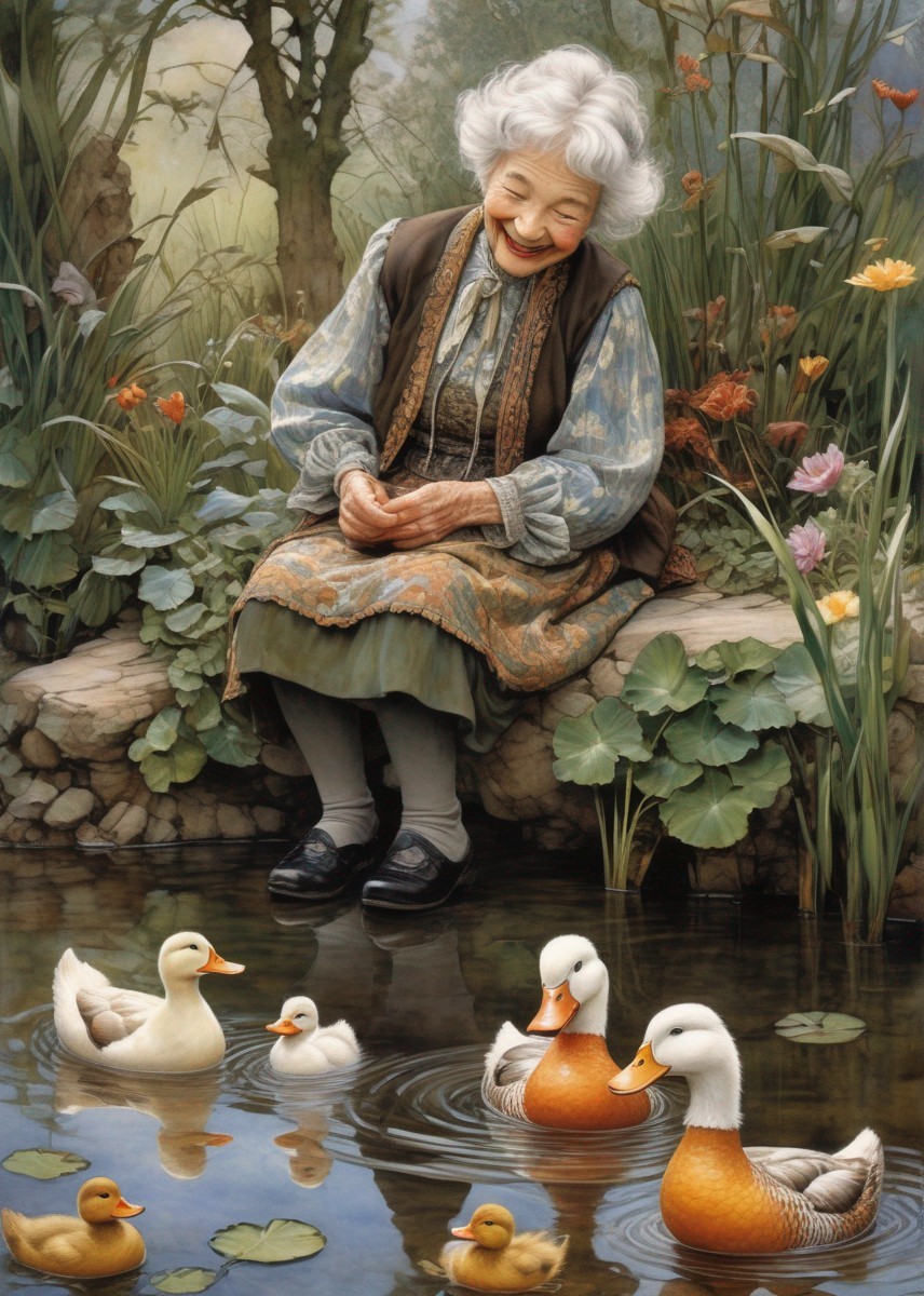 Two elderly women laugh joyfully by a pond with ducks and lilies, surrounded by lush greenery and flowers.