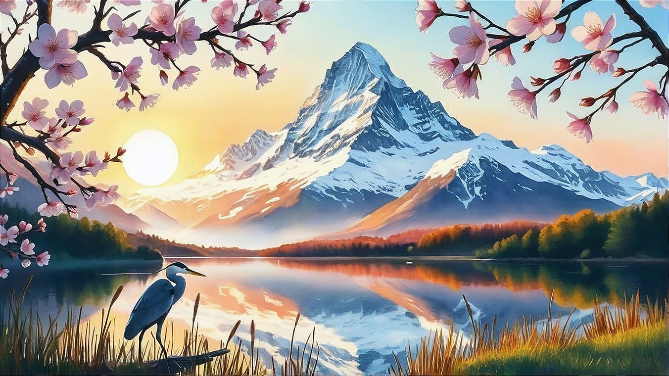 (Try from Ursula) - A serene landscape features a majestic snow-capped mountain reflected in a lake, surrounded by blooming cherry blossoms and soft sunlight, with a heron standing gracefully at the water's edge.