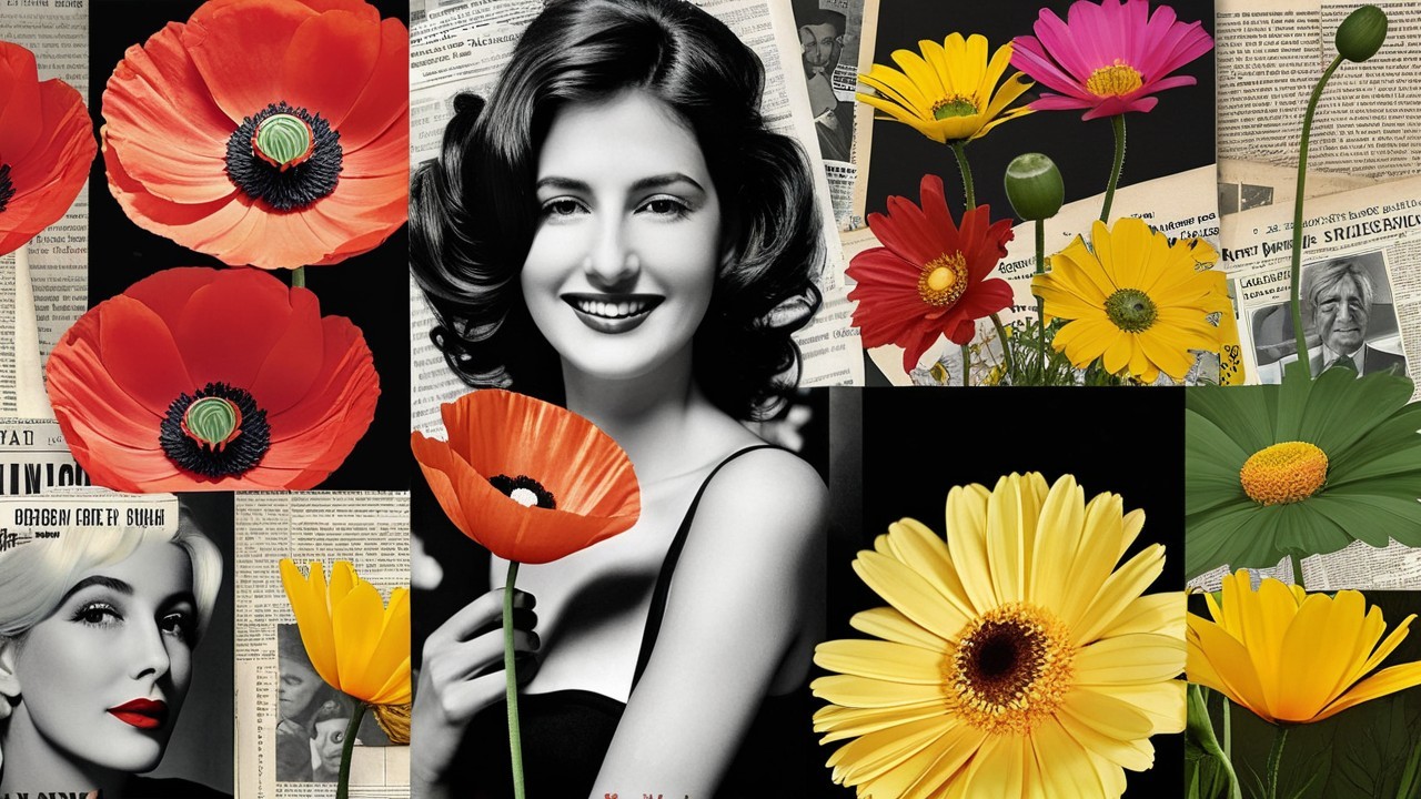 Prompt: "Collage, abstract geometric, newspaper clippings, Human hand Georgia O’Keefe Alfred Stieglitz collage scrapbook cursive writing colorful poppy flowers daisies golden ratio rule of thirds Dadaist poster