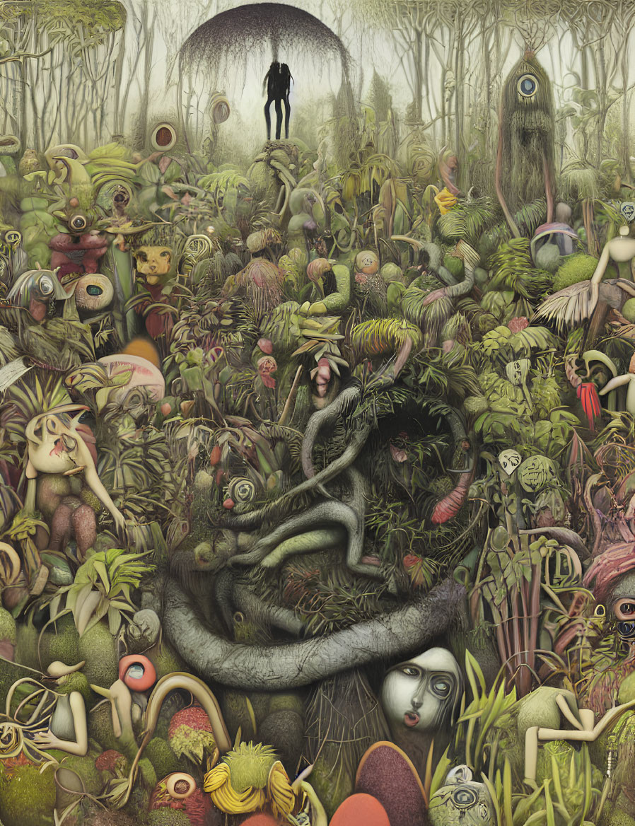 Colorful surreal forest scene with whimsical creatures and unique masks