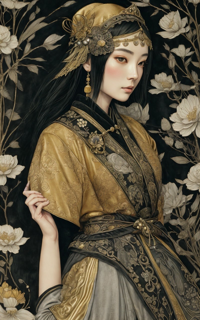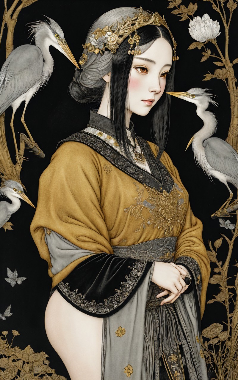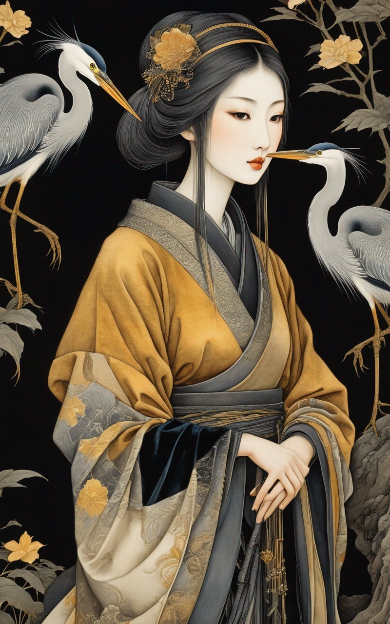 Legend of the Girl and the heron, Medieval Japanese Artists Sumi-e Style, Velvet Black, Shabby, Dull Gold, Amber Gray, Golden Ratio, Surreal Fantasy, Elegant, High Definition Ultra Fine 3D Line, Zenangle Style, Watercolor Patchwork , Arthur Rackham Style, Paul Kidby, Gediminas Prankevicius, Jacek Jerka, Extremely Detailed, Intricate, Thoughtful, HDR, Fractal, Beautiful, Award Winning, Fantasy Look, Fantasy, Crisp Quality