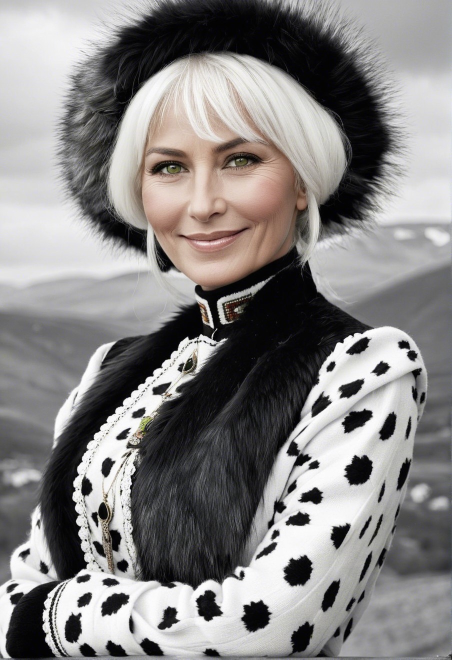 A smiling woman adorned in traditional attire, featuring intricate patterns and a fur hat. Her striking silver hair complements the detailed embroidery and rich textures of her outfit.