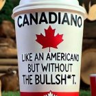 A coffee cup displays the word "CANADIANO" with a maple leaf and the slogan "Like an Americano but without the bullshit." Soft green nature and a Canadian flag are in the background.