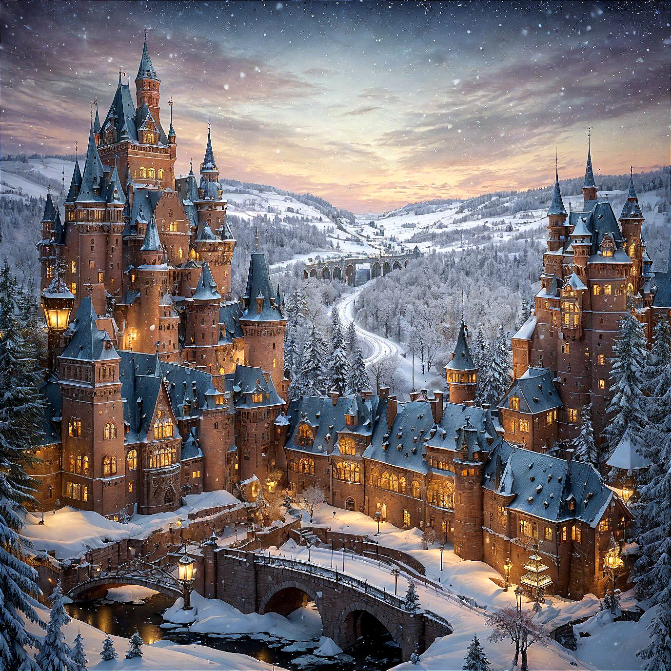 An enchanting snow-covered castle at twilight with illuminated windows, a stone bridge, and a wintry landscape.