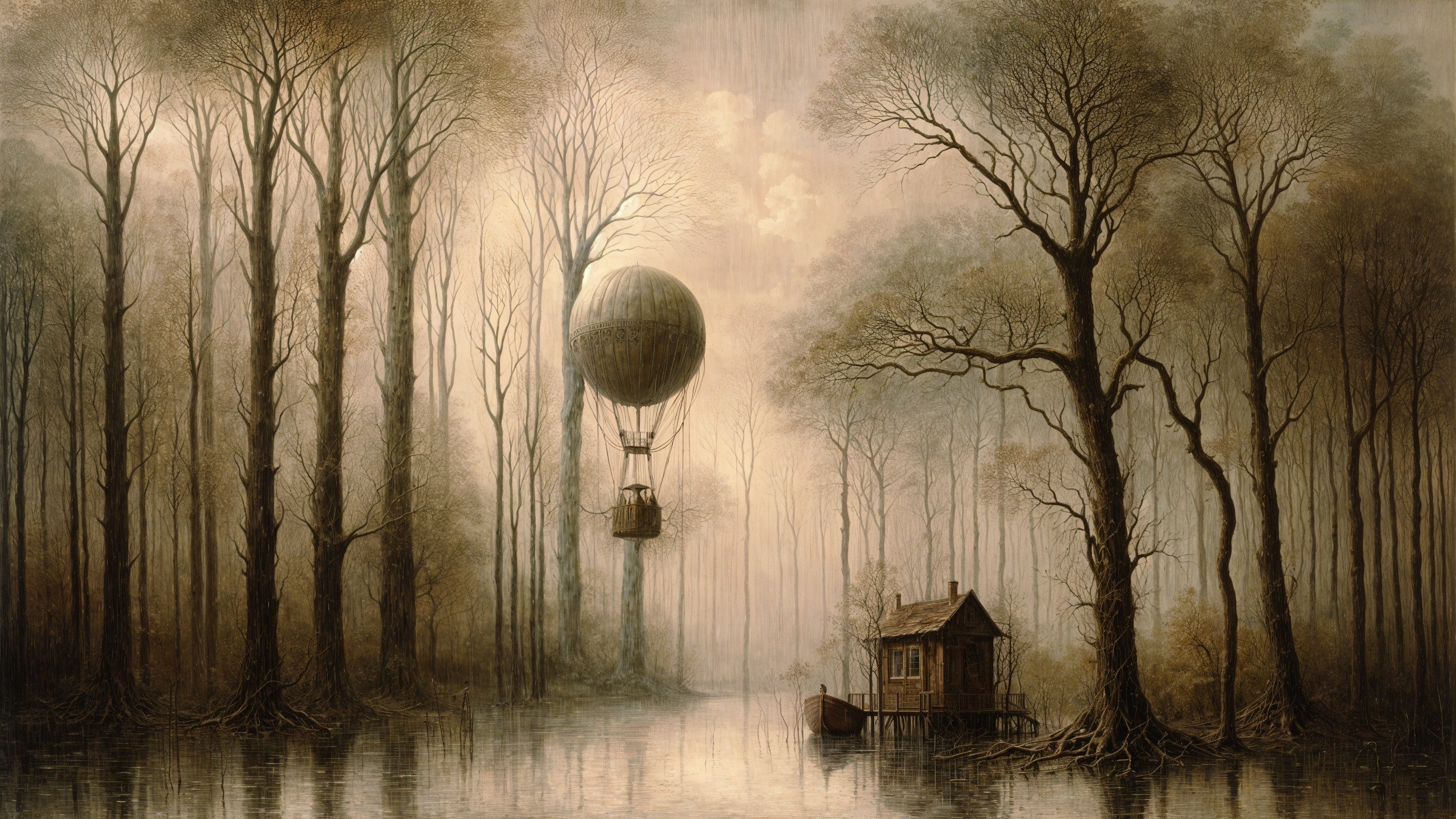 A serene landscape features tall trees and a winding river, bathed in soft sunlight. A solitary umbrella and lightbulb, floats gently down, adding a whimsical touch to the tranquil autumn scene.