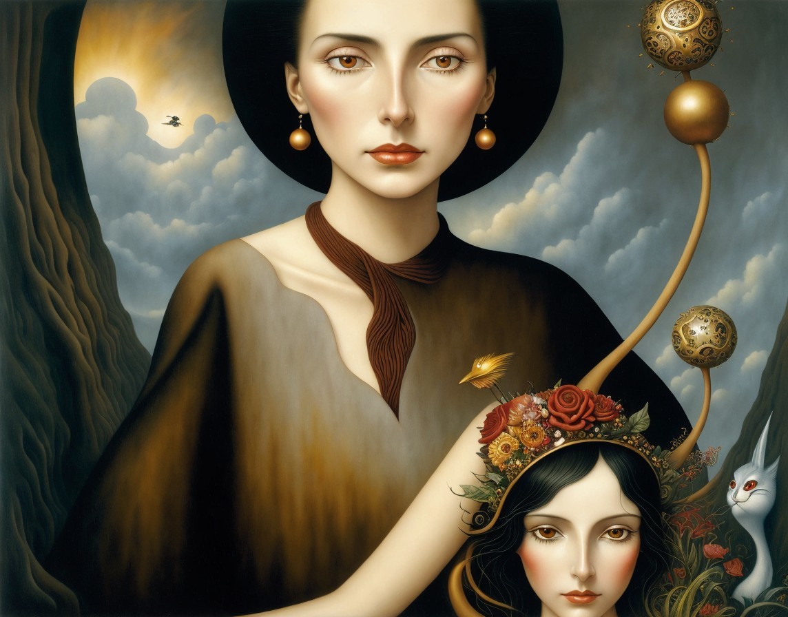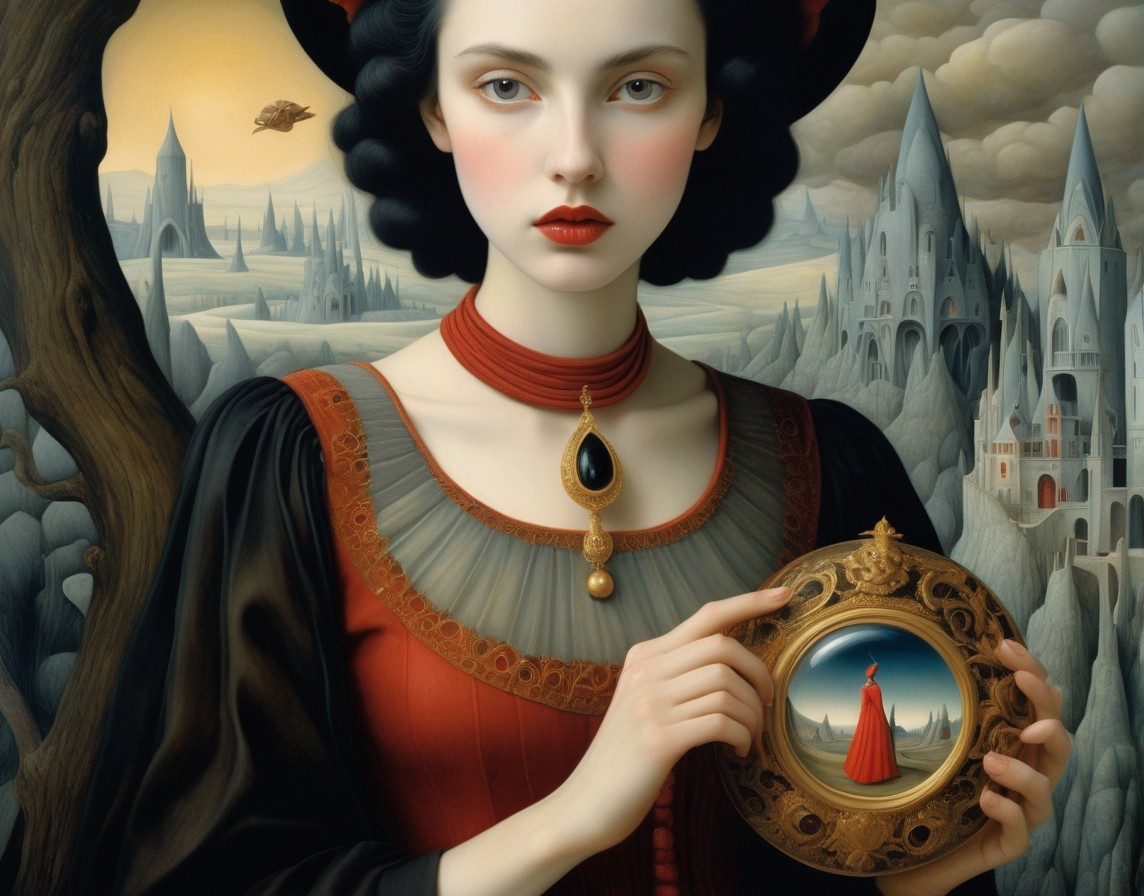 An illustration of a stylized woman with a wide-brimmed hat in a vintage dress before a fantastical coastal background.