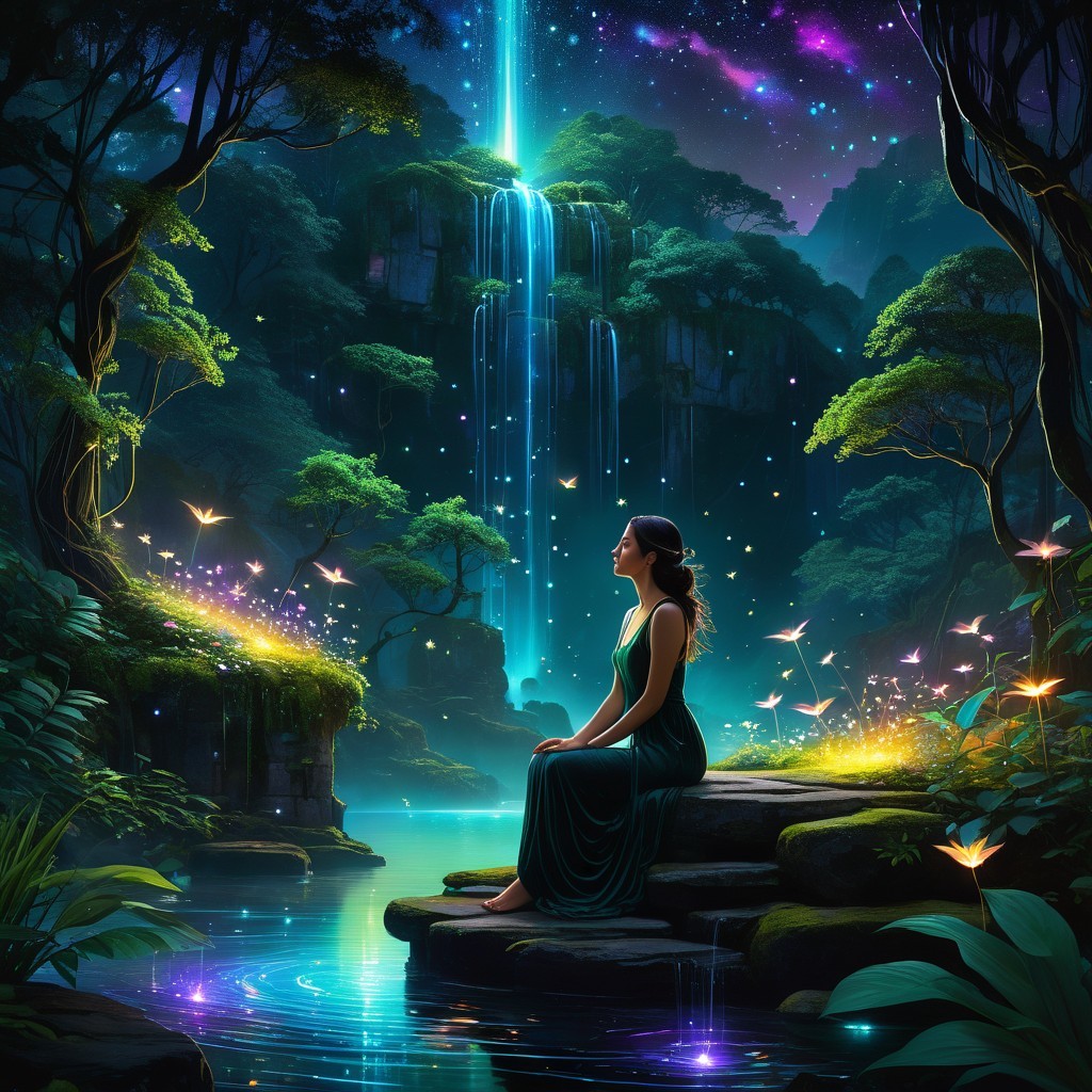 Prompt: "iridescent paint on black background, minimalist female model zen lines,Enchanted forest, mystical creatures, glowing fireflies, ethereal light beams, ancient ruins, magical portals, whimsical floating islands, starlit skies, shimmering constellations, lush greenery, cascading waterfalls, fantasy landscape, vibrant colors, soft and dreamy lighting, digital painting, intricate details, surreal atmosphere."