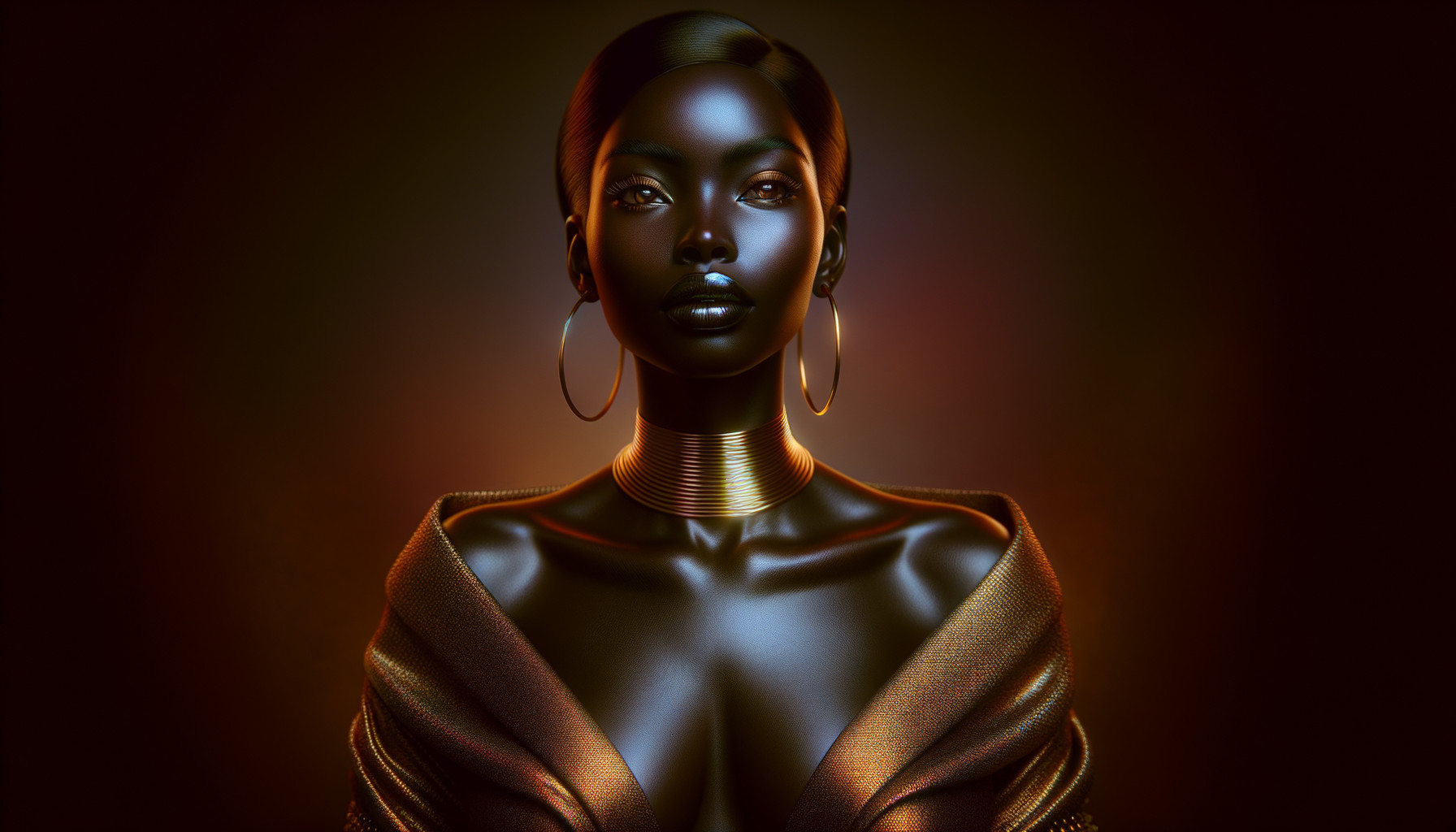 A woman with striking makeup and elegant golden accessories set against a warm, sparkling backdrop.