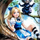 A whimsical scene featuring a young girl in a blue dress with a big bow, sitting on a tree branch alongside a grinning, giant Cheshire cat in an enchanted forest.