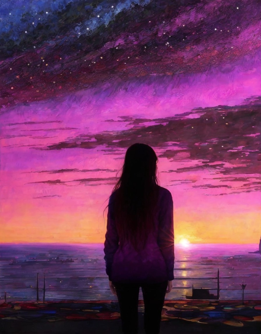 A person gazes at a vibrant sunset over water, with purple and pink hues dominating the textured, painting-like scene.