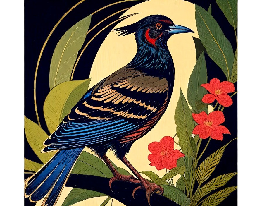 Prompt: "Woodblock print of a highly stylized bird in a fantasy garden in the fluid composition of Agnes Miller Parker and the decorative charm of Domjan Jozsef"