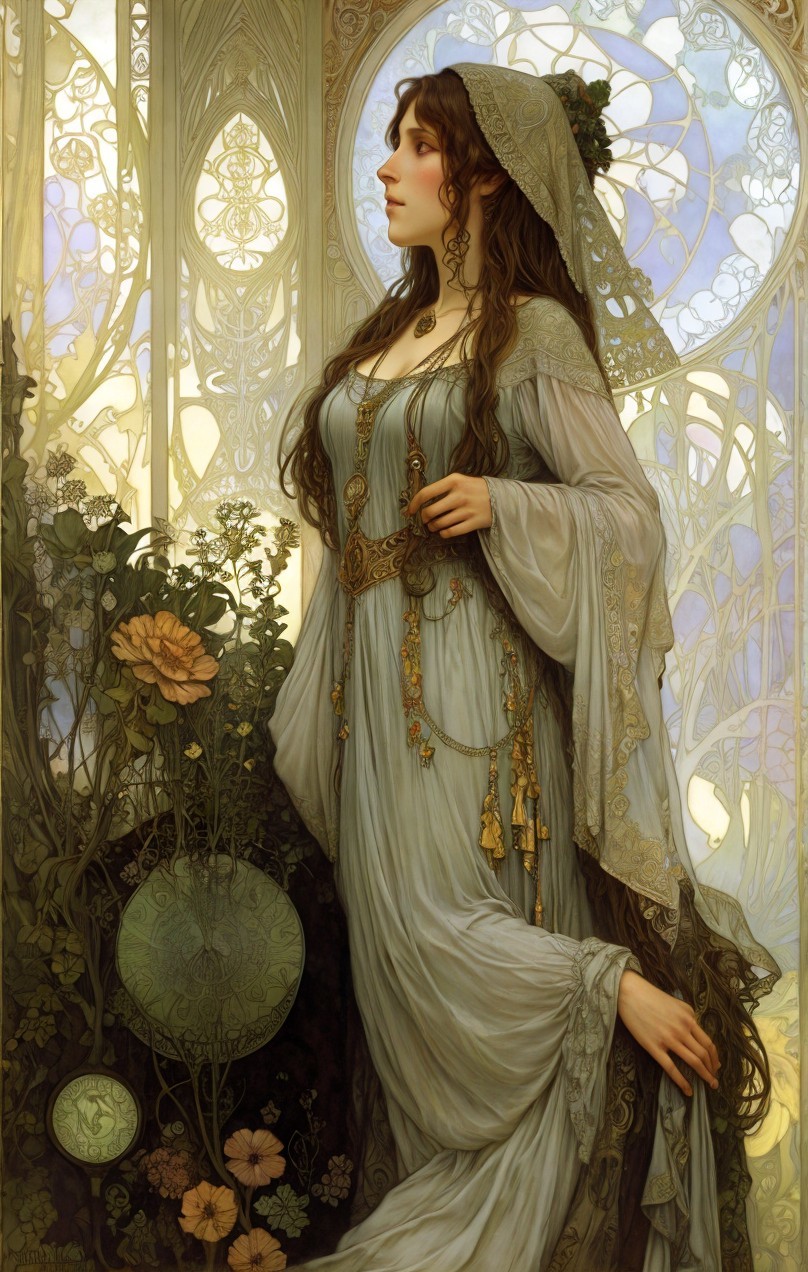 A woman in flowing blue attire sits pensively in a stone archway by the sea, adorned with a floral wreath.