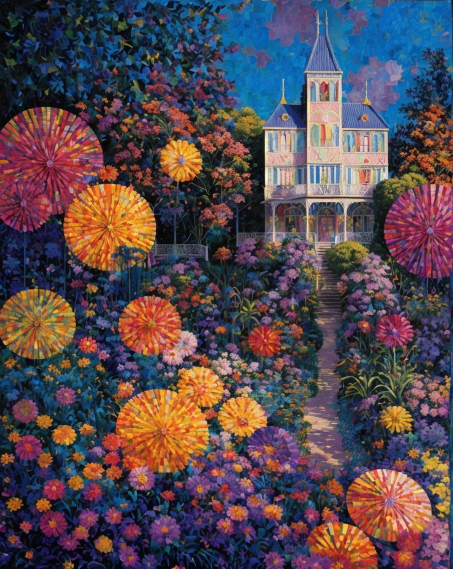Prompt: "style of Sue Reno, Javier Mariscal, Paul Signac, Lee Mullican, John Lowrie Morrison, John Anster Fitzgerald, Ronnie Landfield: An artwork depicting old mansion with beautiful carnival glass windows, kitsch aesthetic, Olivia Gibbs, Rui palha, Victoria Ball, bright palette, meticulous details, nabis, in the style of bold patterned quilts, textured sand paper effect, soft yet vibrant, cute and dreamy, pattern-based painting, bright spring colors, windows vista, quirky characters and objects, use of vintage imagery."