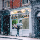 A charming storefront featuring colorful displays of goods under a striped awning. A woman rides a bicycle past, adding a lively touch to the quaint scene on a picturesque street.