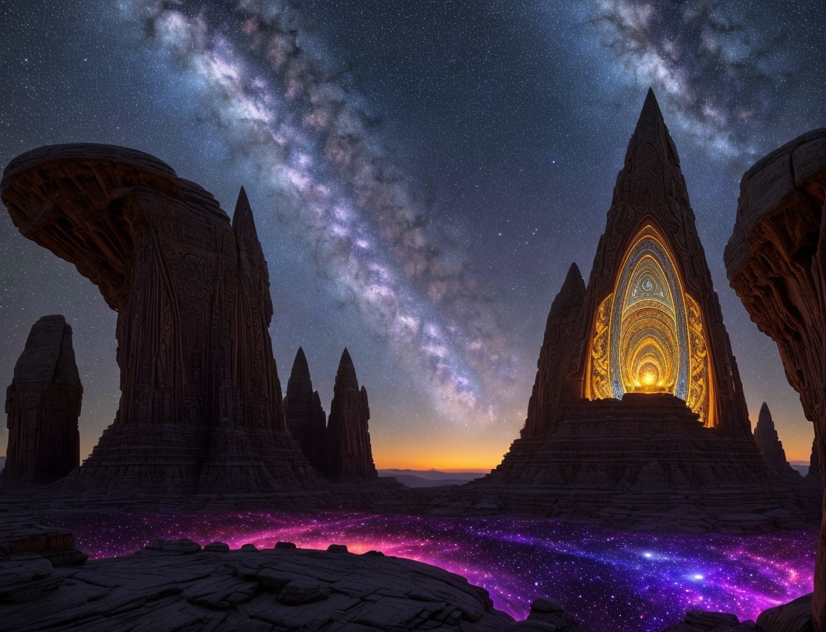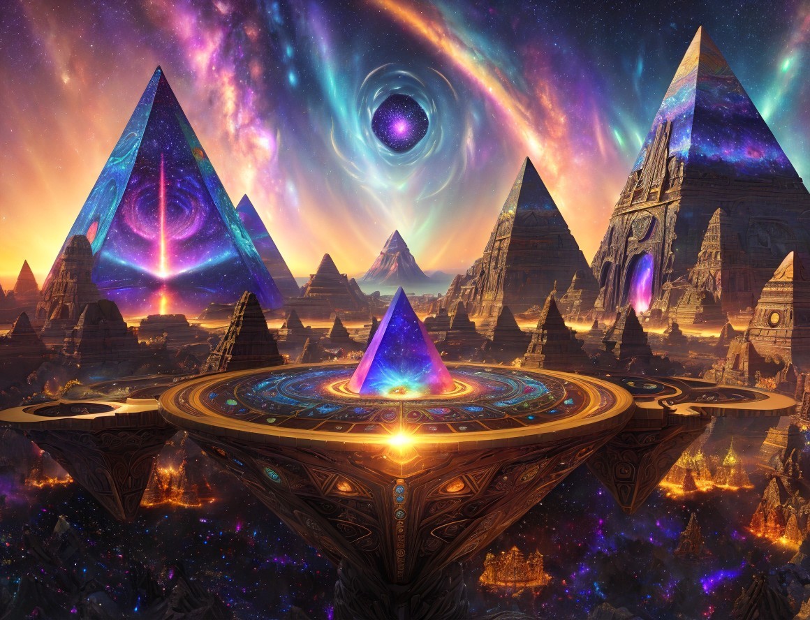 an intricate 4K visionary art masterpiece that serves as a galactic DMT wallpaper. Envision an ornate extraterrestrial cosmic wormhole nestled within an alien pyramid temple crafted from granite, adorned with mesmerizing geometric patterns.