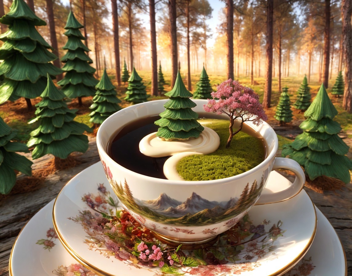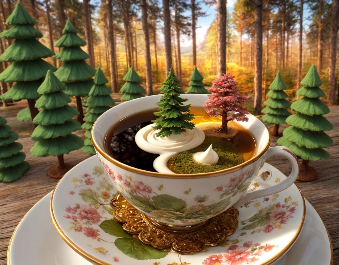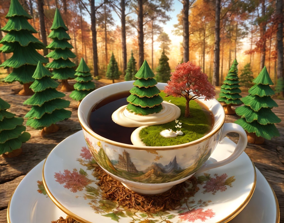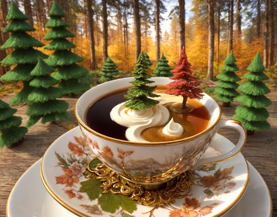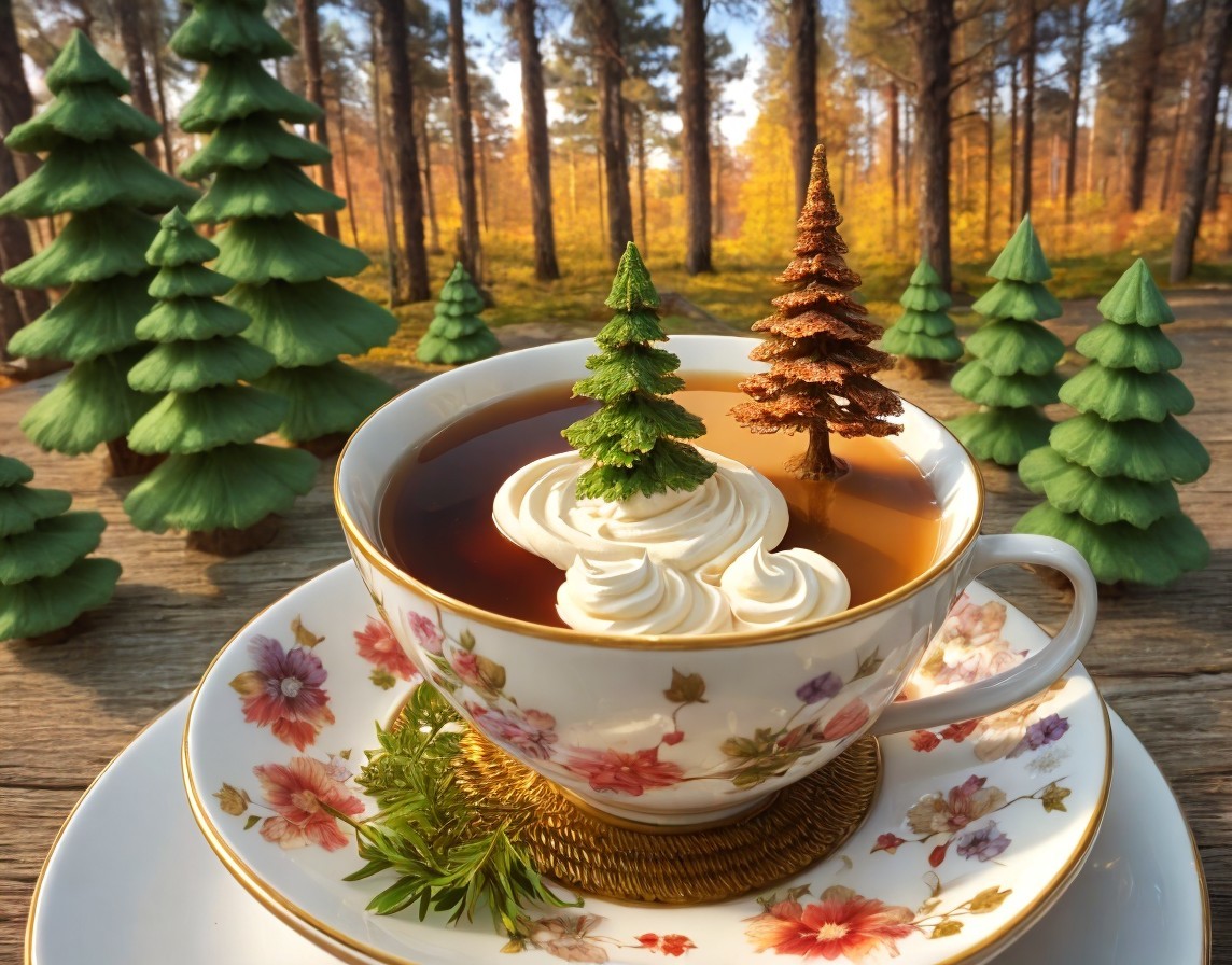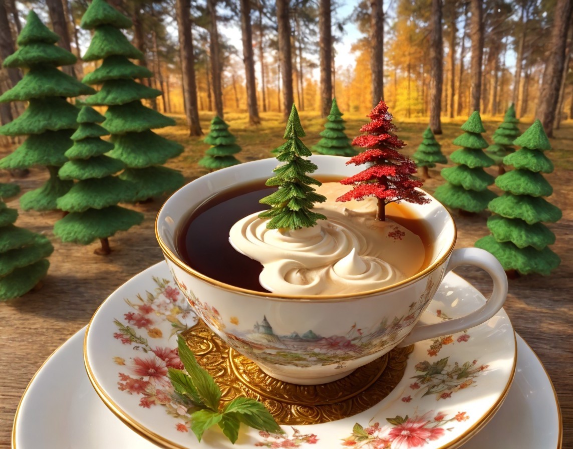 A whimsical cup of tea with Christmas trees and whipped cream on a wooden table in a sunlit forest setting.