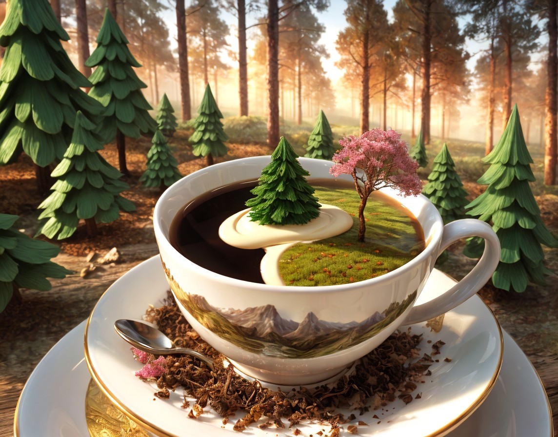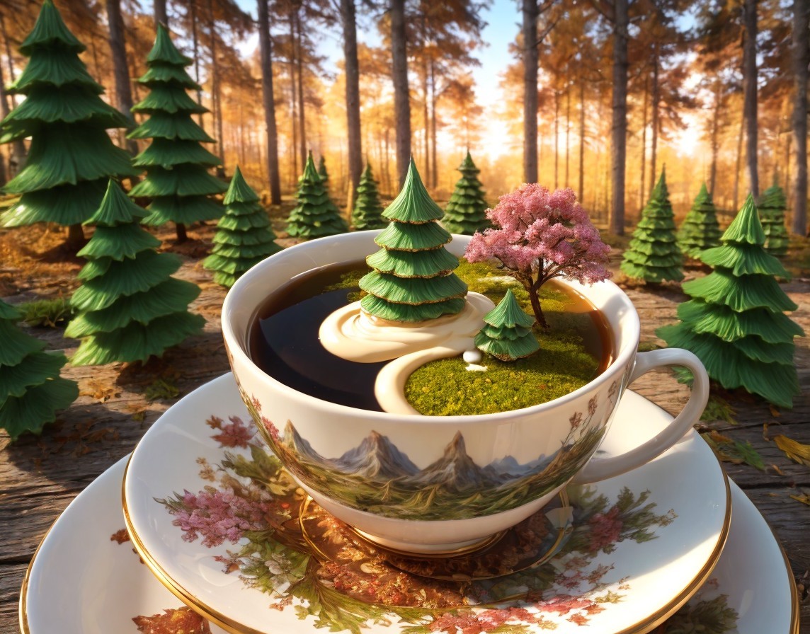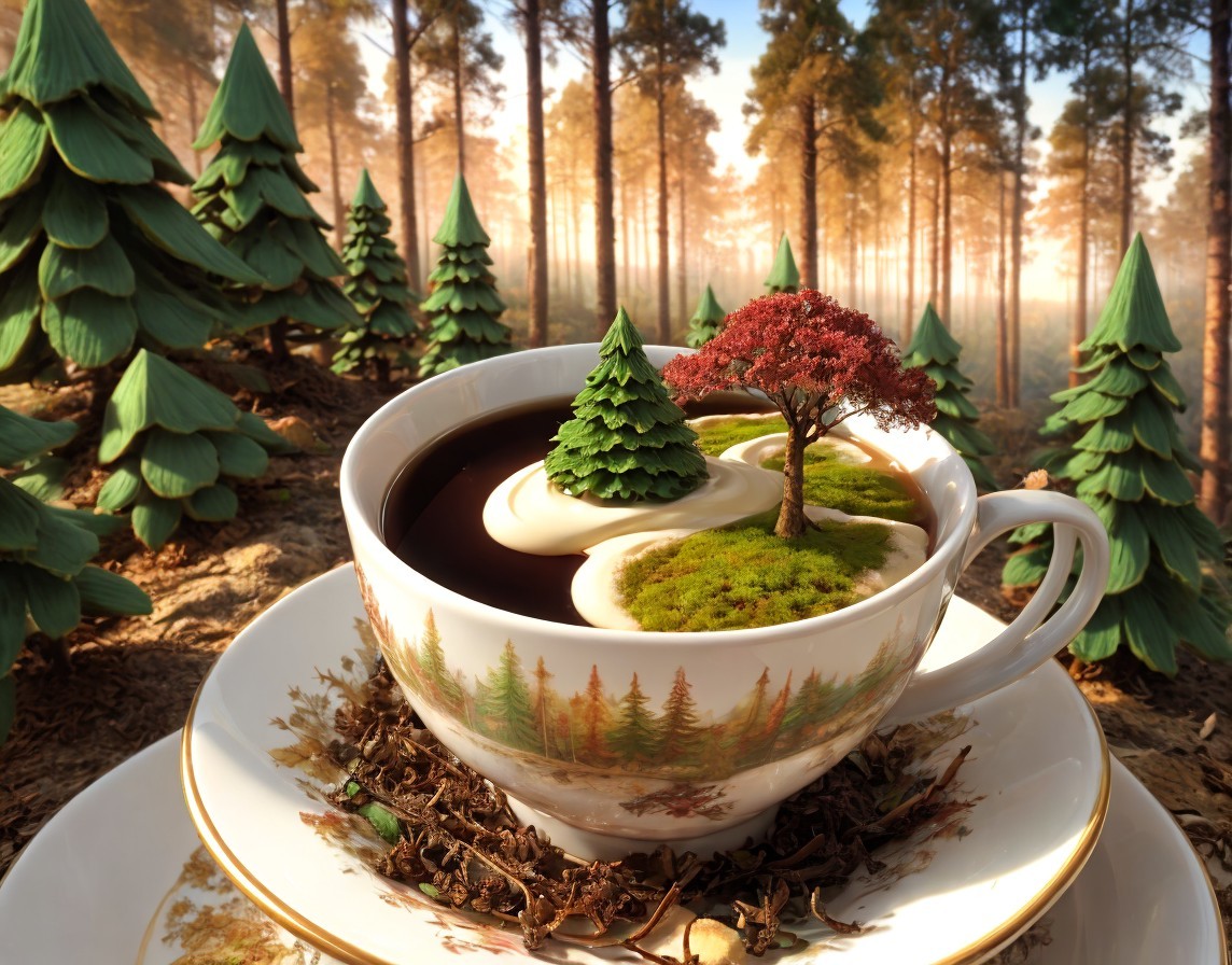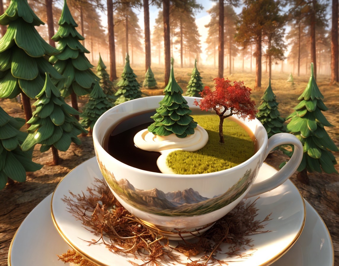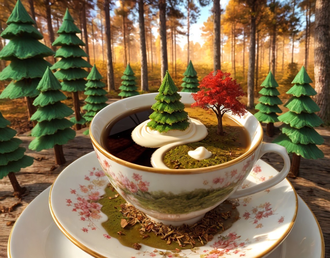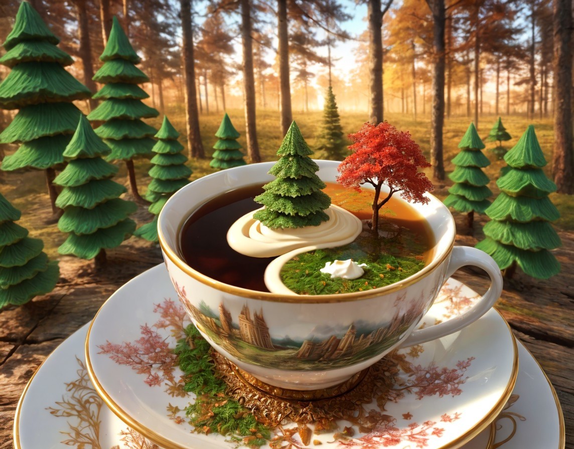 A whimsical cup of tea with Christmas trees and whipped cream on a wooden table in a sunlit forest setting.