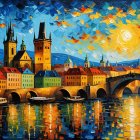 A colourful painting of Prague at sunset, featuring historical buildings, a bridge, and reflected lights on the water. The sky is filled with swirling, expressive clouds.