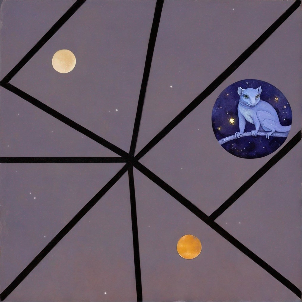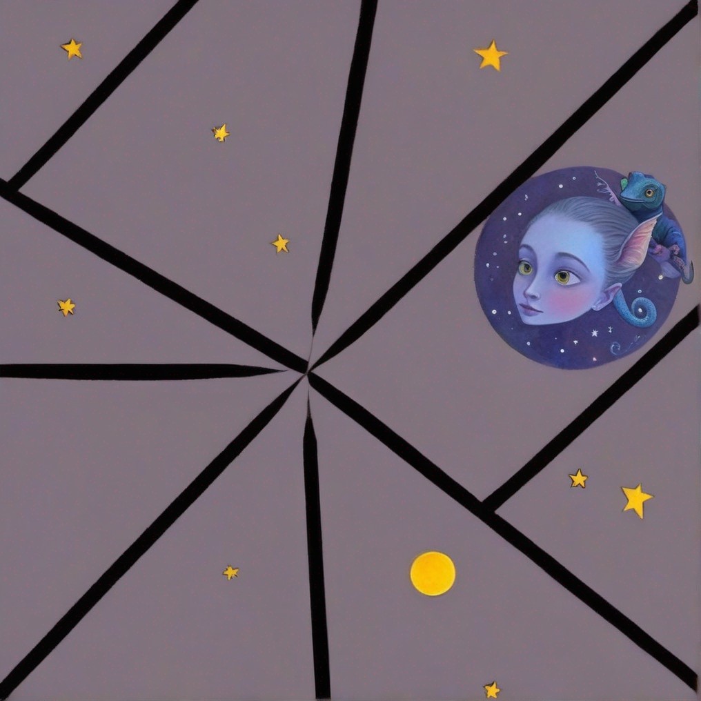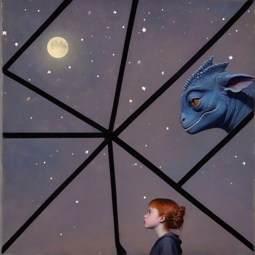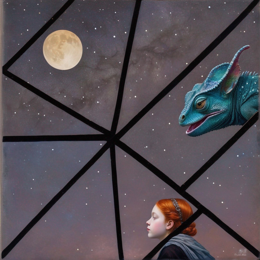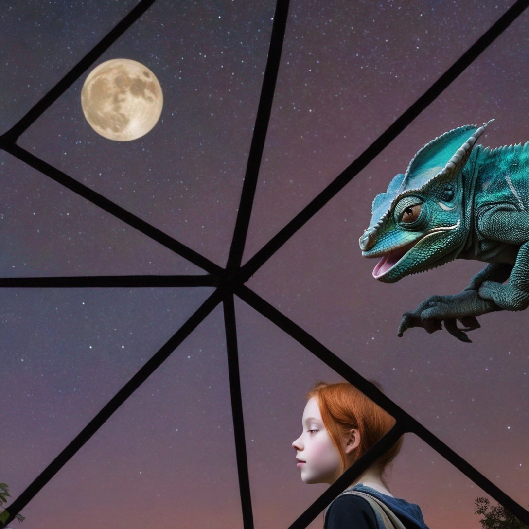 Girl gazes at starry night sky with full moon; chameleon blends in.