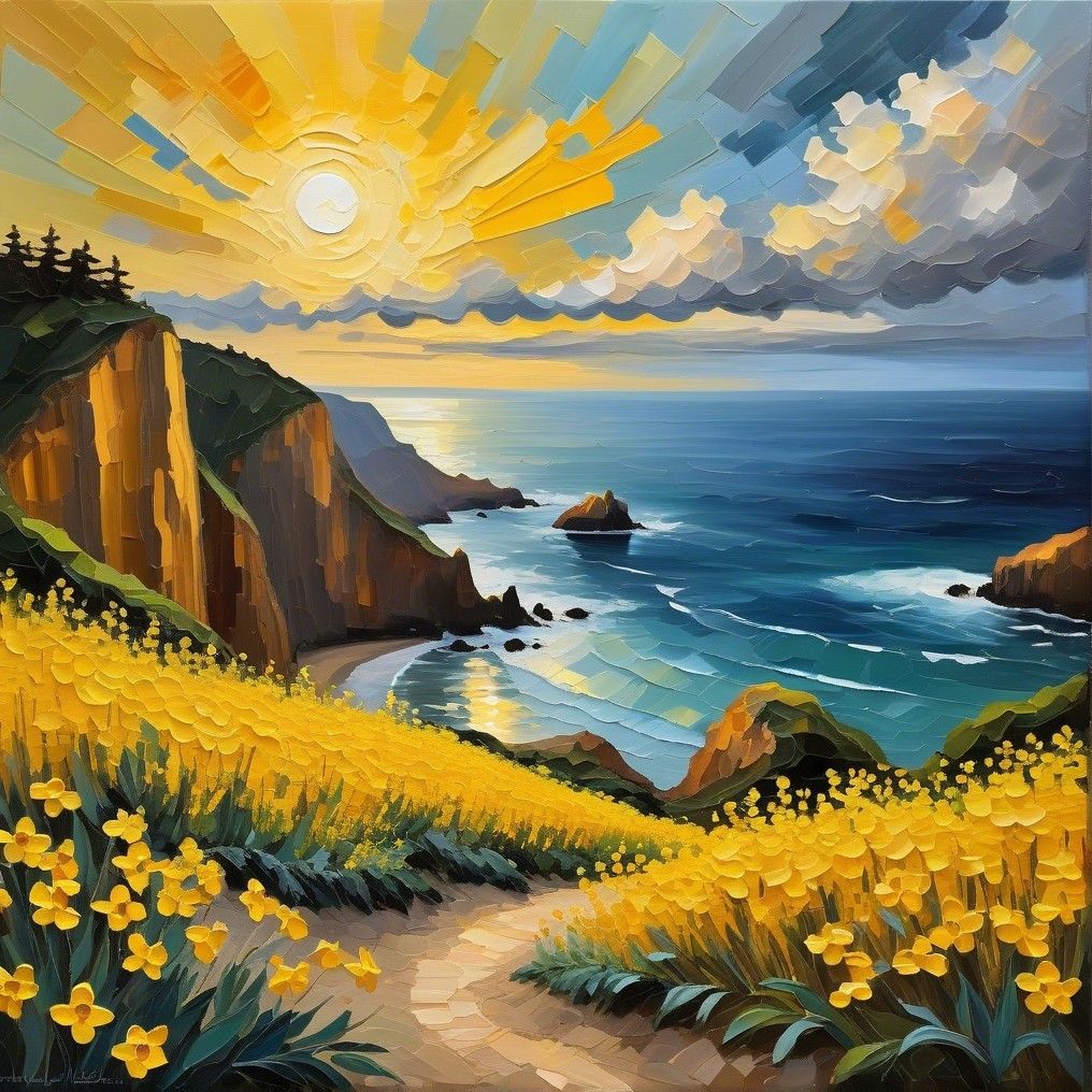 A cliffside path lined with yellow and violet blooms winds down to a glowing sea under a storm-brushed dusk sky. Light dances across the waves while heavy clouds linger, blending serenity and tension in painterly impasto.
