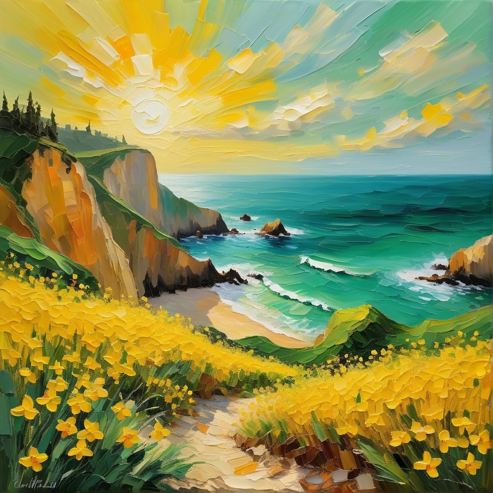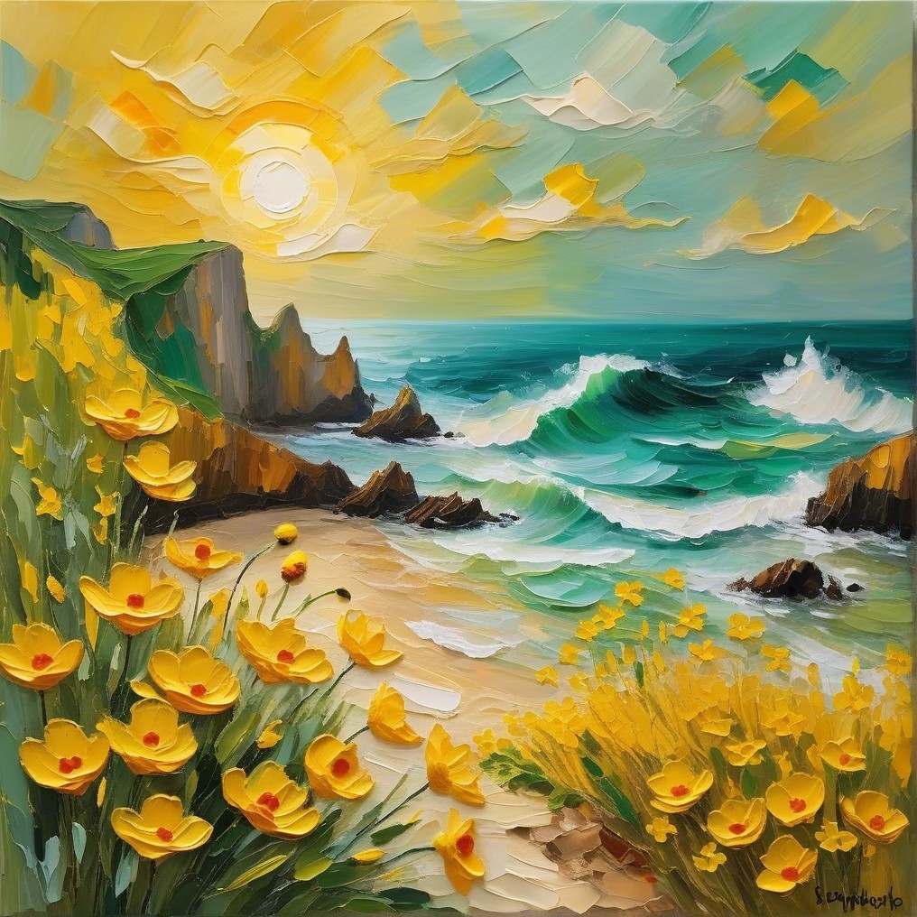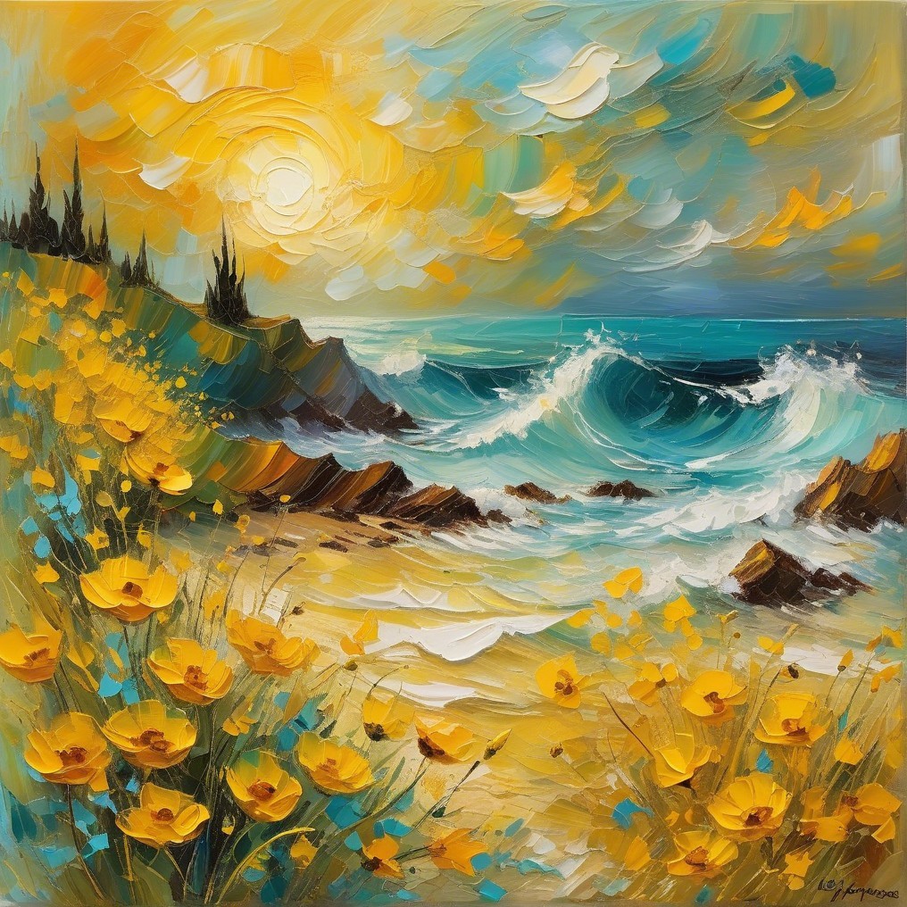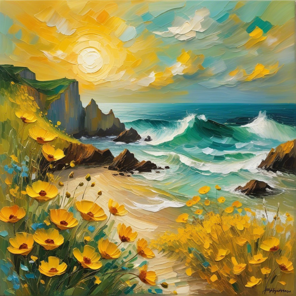 Artistic Statement: This piece is a fusion of post-impressionist technique with contemporary landscape romanticism. Impasto texture evokes tactile presence, while the dramatic lighting and bold florals convey symbolic emotion—where wildness meets solace at the ocean’s edge.