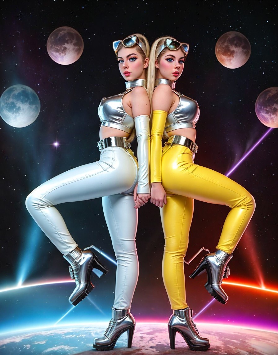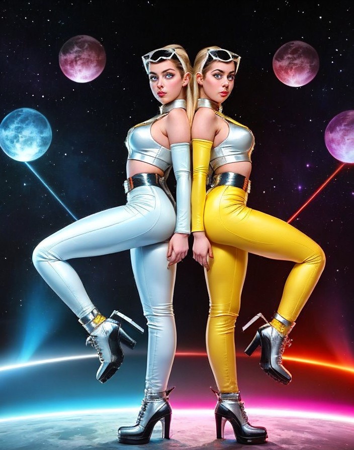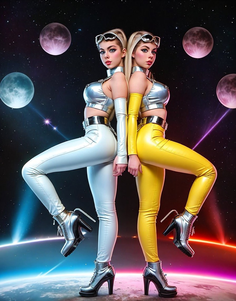 Prompt: "Two headed girl, 20 years old two headed Kira kosarin doppelgänger as Barbarella with circa 1970, girl with two heads, Siamese twin, chromatographic photography, science fiction elements, retrofuturistic, retrofuturism, technology, Barbarella pose, posing, dynamic lightning, side eyes, fully dressed, overalls, high waist pants, suspenders, fashion, 1970s"