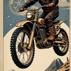 A vibrant, surreal scene depicts a woman in a helmet riding a motorcycle through a colorful landscape, with swirling skies and majestic mountains in the background, exuding a sense of freedom.