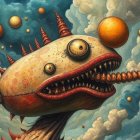 A surreal creature with a bulbous head and multiple eyes, adorned with spikes and a long, spiral appendage. It’s set against a dramatic sky filled with vibrant clouds and floating spheres.