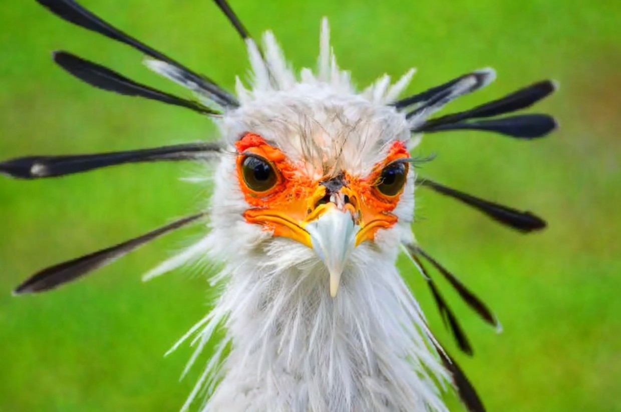 The image features a striking bird with a white feathered body, vivid orange facial markings, and long black plumes protruding from its head, set against a vibrant green background.