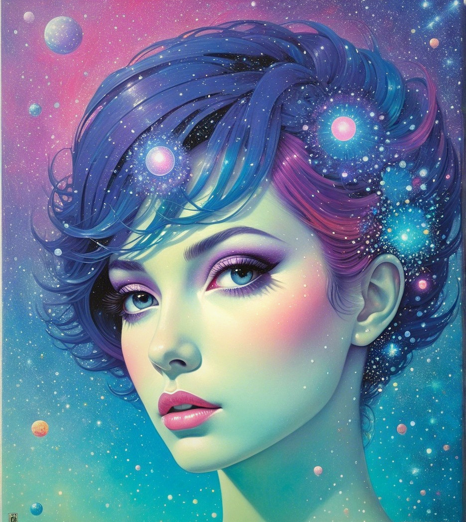Vivid dream world, surreal dreamscape by Wayne Barlowe and Arlie Opal, stencil artistry, geometric intricacies, space-age and pulp sci-fi fusion, cel-shaded, parallax occlusion 1.3, multi-perspective, layered sparkles and flecks, overspray of watery paint, plasticity 1.3, brightness 1.3, painterly style with tiny and heavy brushstrokes by Brandon Mably, dyed, subsurface scattering 1.3, parallax occlusion 1.3, raytraced shadows 1.3, harmonious, quilling, tinc details, agile, mystical, hand-drawn illustration style, triadic color scheme dark-blue baby-blue light-grey, flowing dark hair, cel-shaded line-art details, floating lighting, psychedelic essence, futuristic vibes, glowing elements, wavery exaggerated forms, micro-pen detailing, stippling effects, push processing magic, post-avantgarde allure, thin-lined illustration, tall and lean structures, asymmetrical color gradients, raytraced shadows for depth, 3D illusions, comic book cover inspiration, foampunk elements, metallic hues, stacked line patterns, motility, contoured designs, gradient tones, whimsical and vibrant patterns, stylized surrealism, intricate whimsical detailing, by Ed Binkley and Earl Moran and Syd Mead, lighting in Gerald Brom's style, restrained lighting. visible textures, color shifts, multi-layered light-blue hues. Art style inspired by John Buscema, expressive and bright, stylized illustration, linework, graceful, soft watercolor washes, misty, dyed, softened lighting, great depth and scale, tonalism reminiscence,