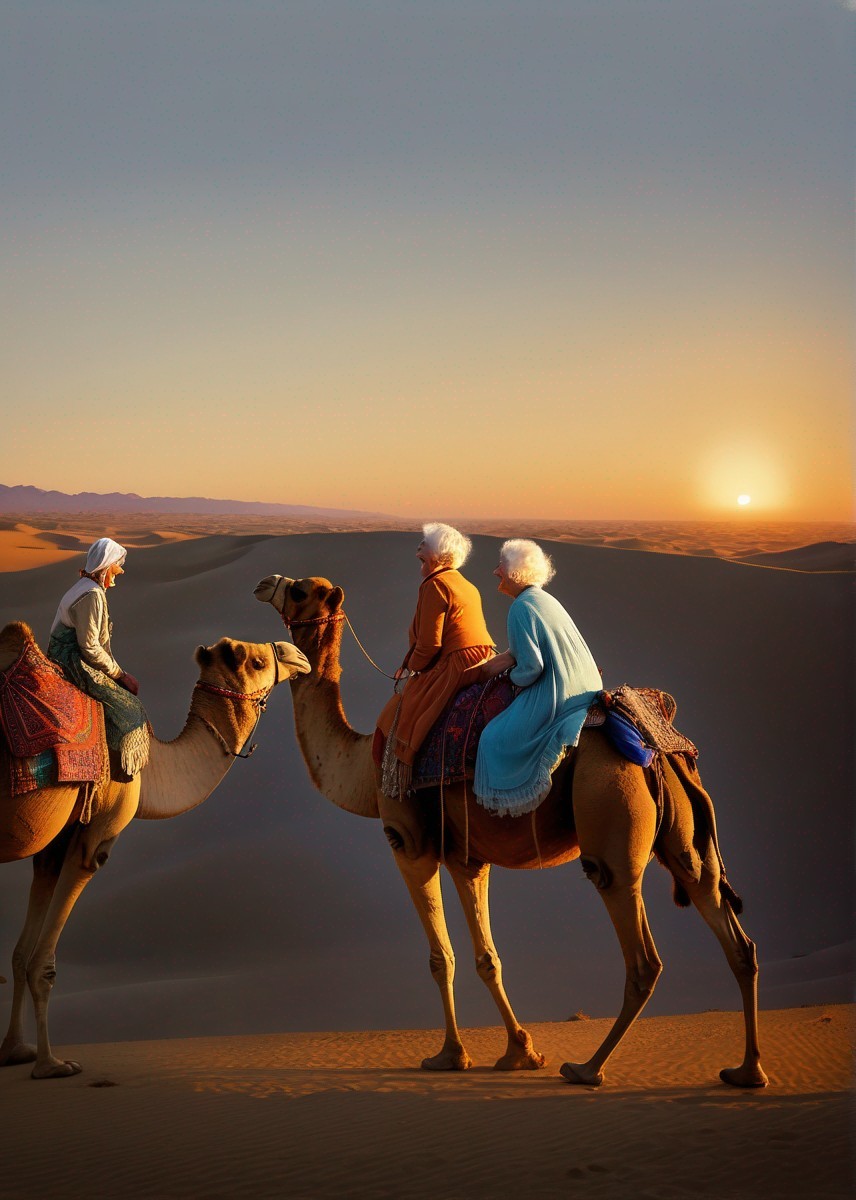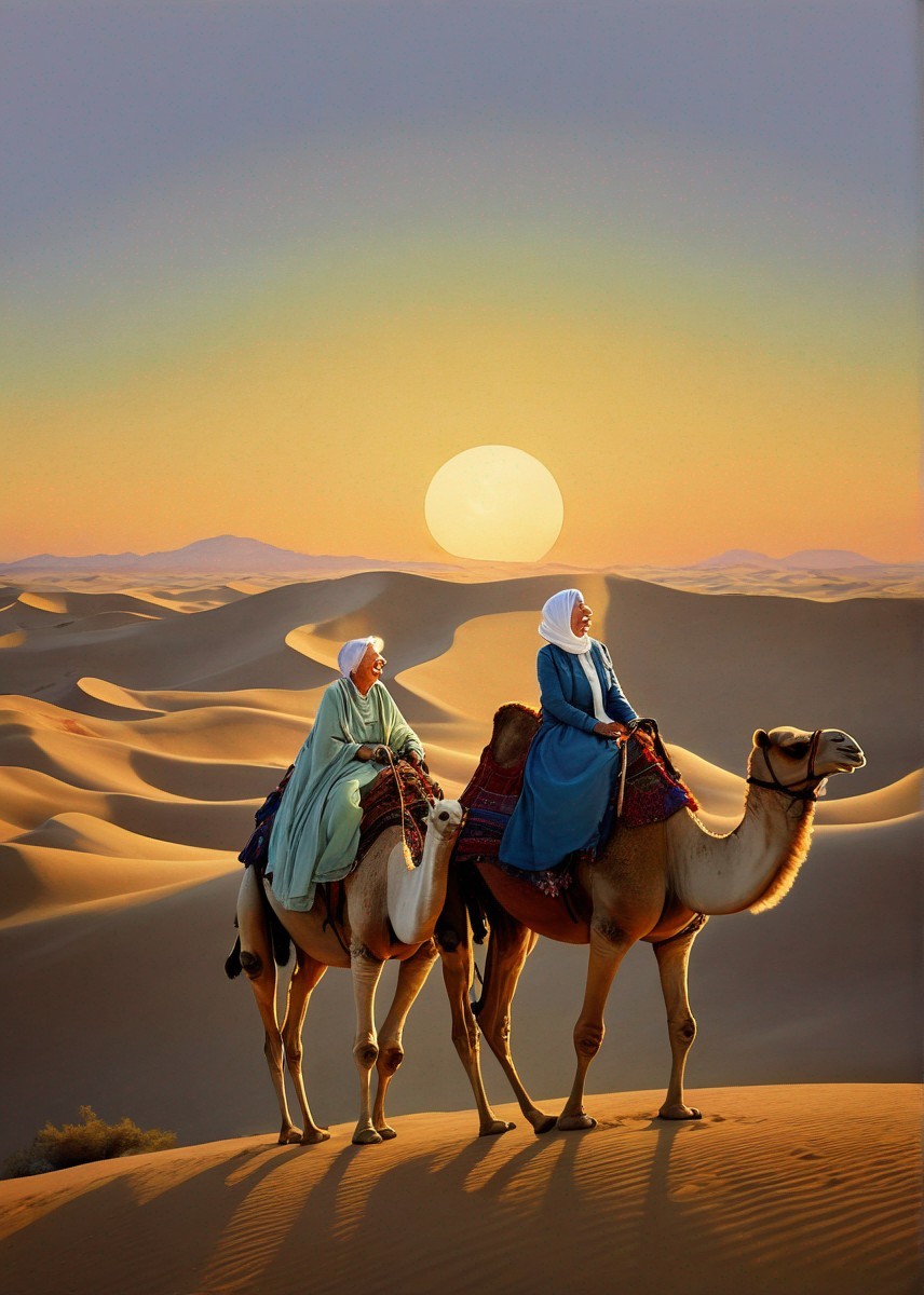 Two joyful elderly individuals are riding camels in a desert with a beautiful sunset and sand dunes in the background.