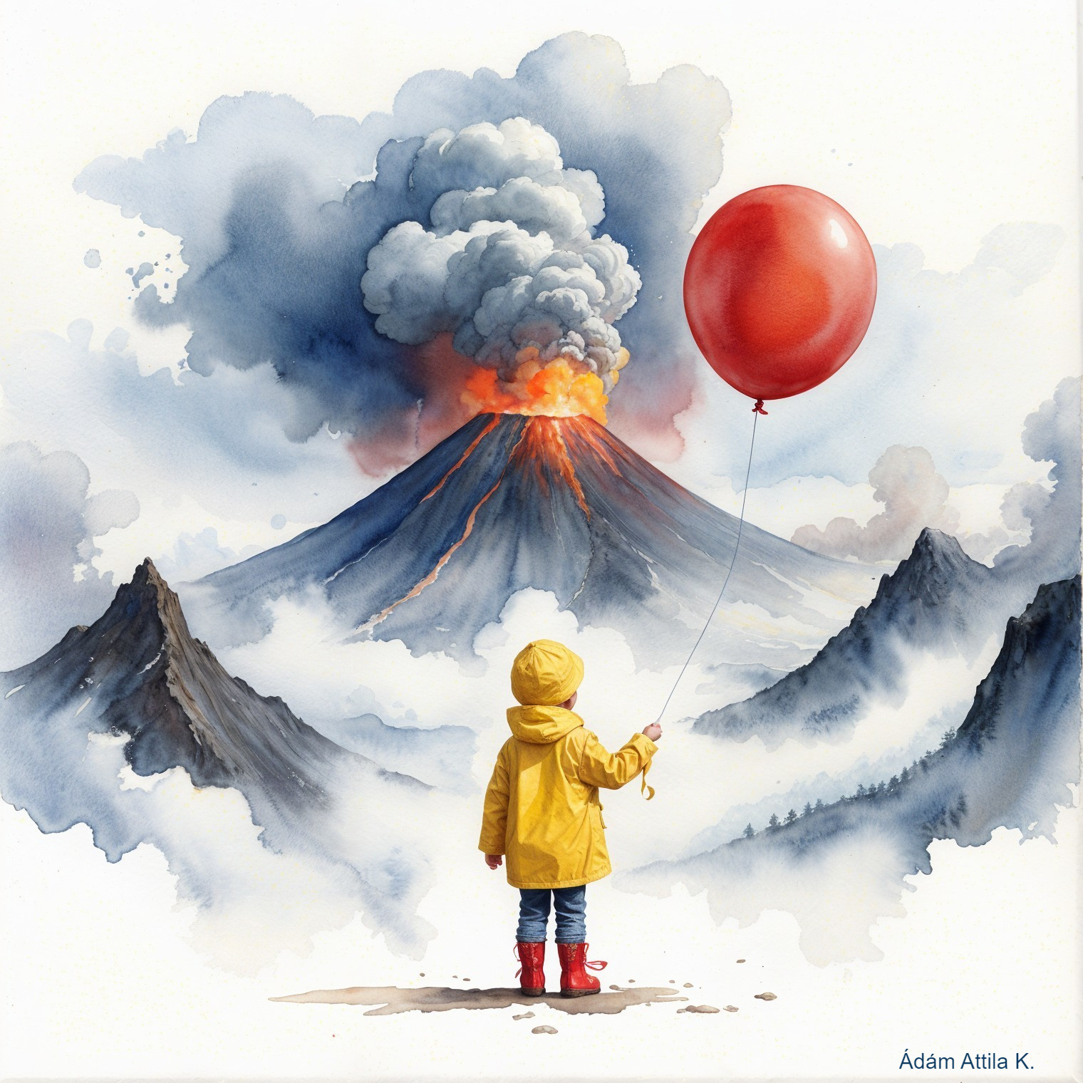 A little boy wearing a yellow raincoat, blue jeans and red boots, holding a helium-filled floating balloon and looking at an active volcano. Misty clouds cover the landscape in the background...