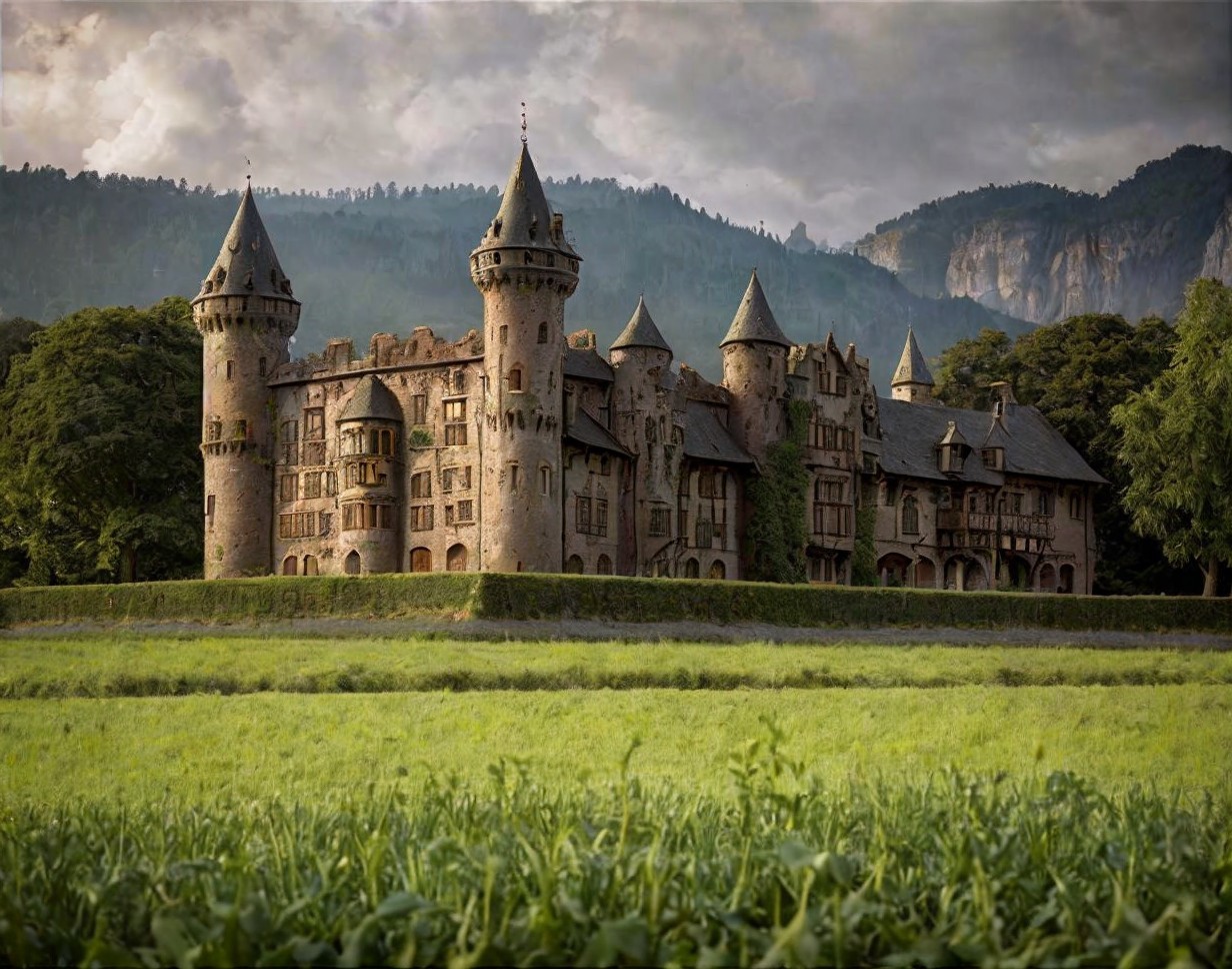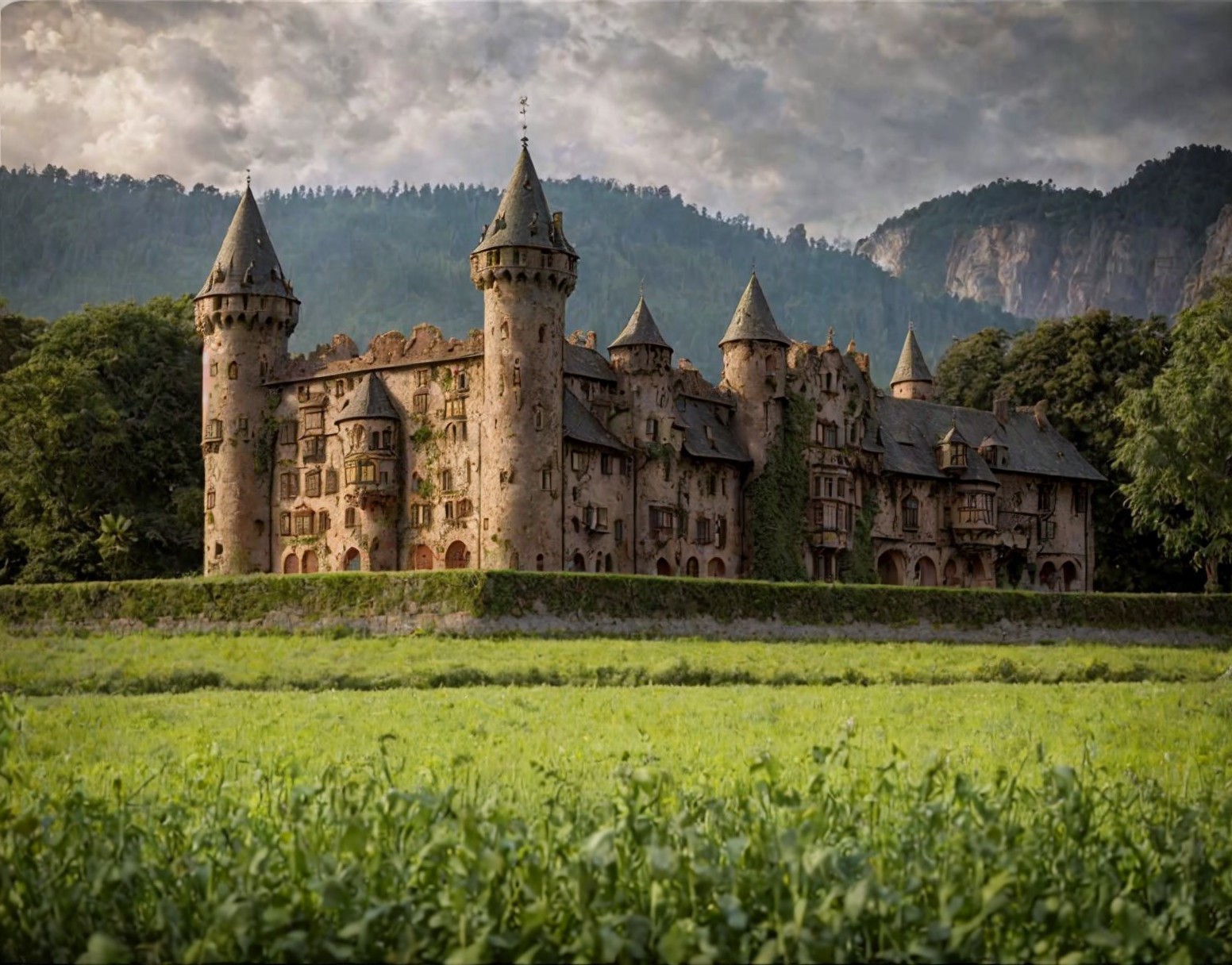 A majestic medieval castle surrounded by lush greenery, featuring towering turrets and stone walls, set against a backdrop of rolling hills and a dramatic sky. Nature and history intertwine beautifully.