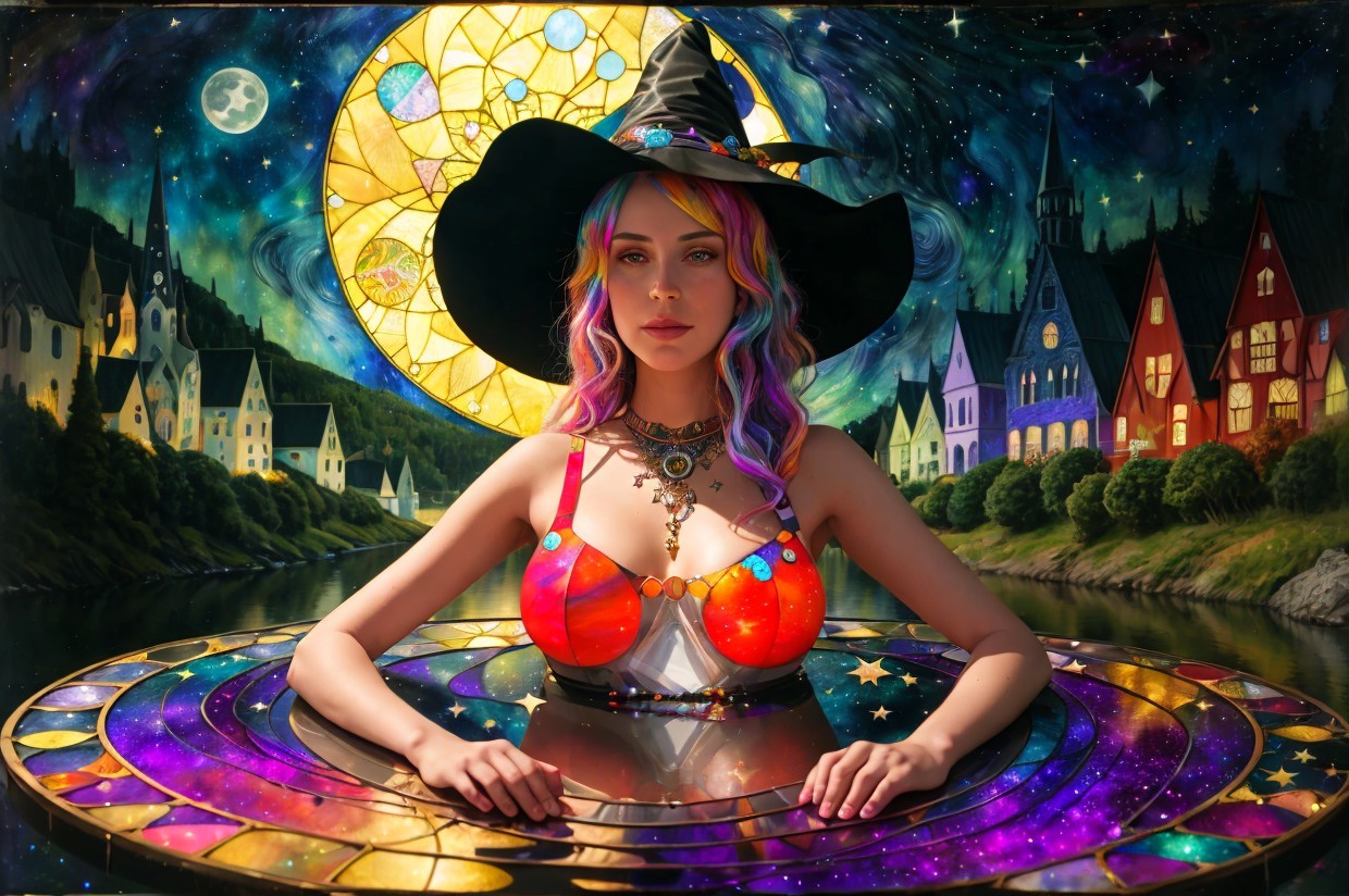 + Prompt:witch in river casting portal spell, night, intricate absurd cosmic night sky with a full bright large moon and stars, parts of background is a photo of galaxies, made of mixed media, acryllc, stained glass and metallic paints, small detailed inks by Gustav Klimt