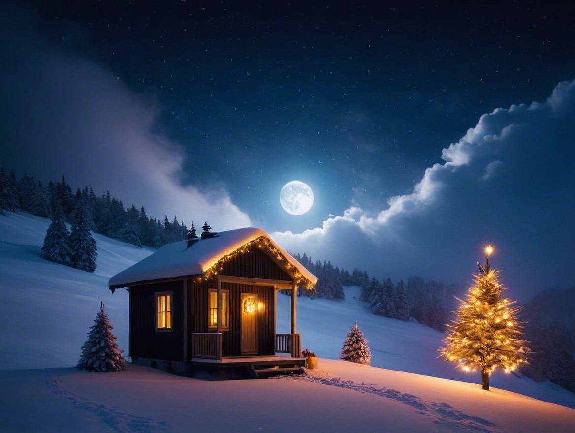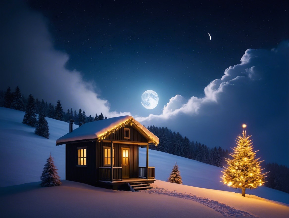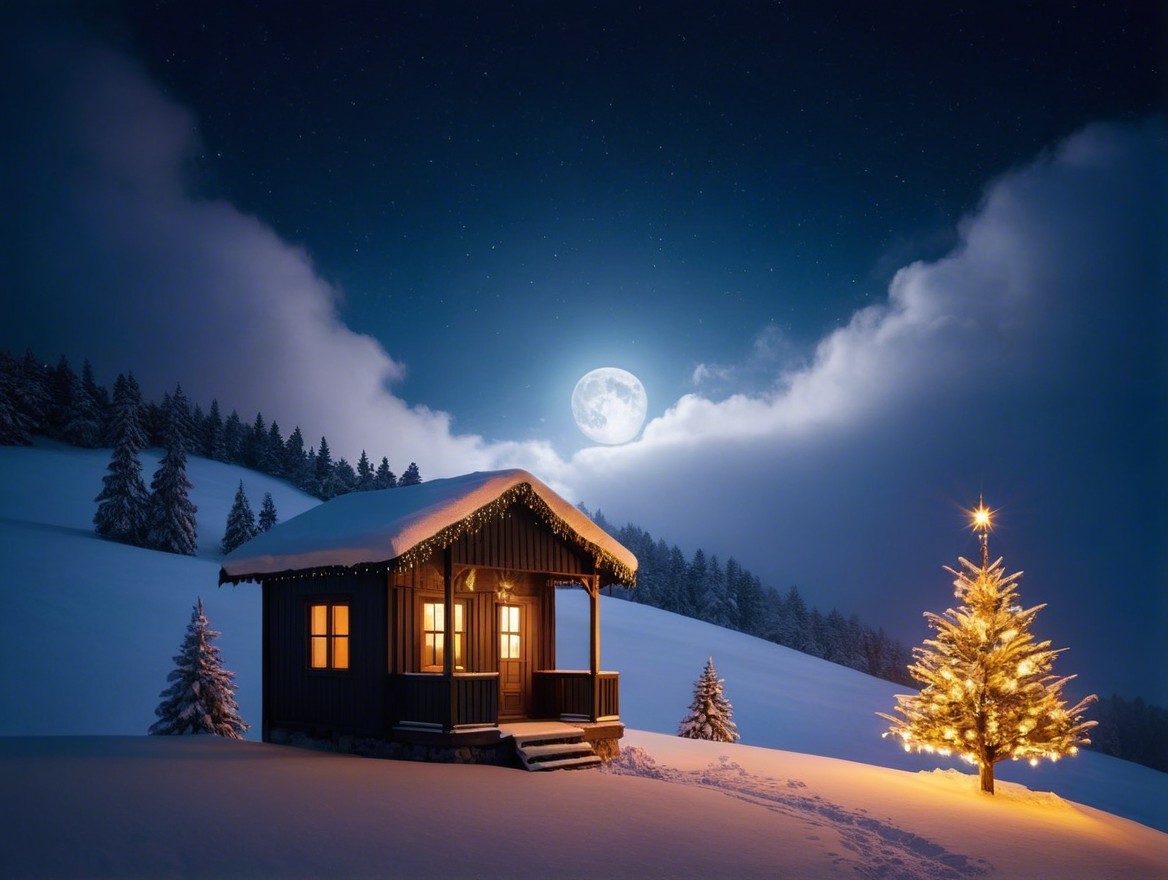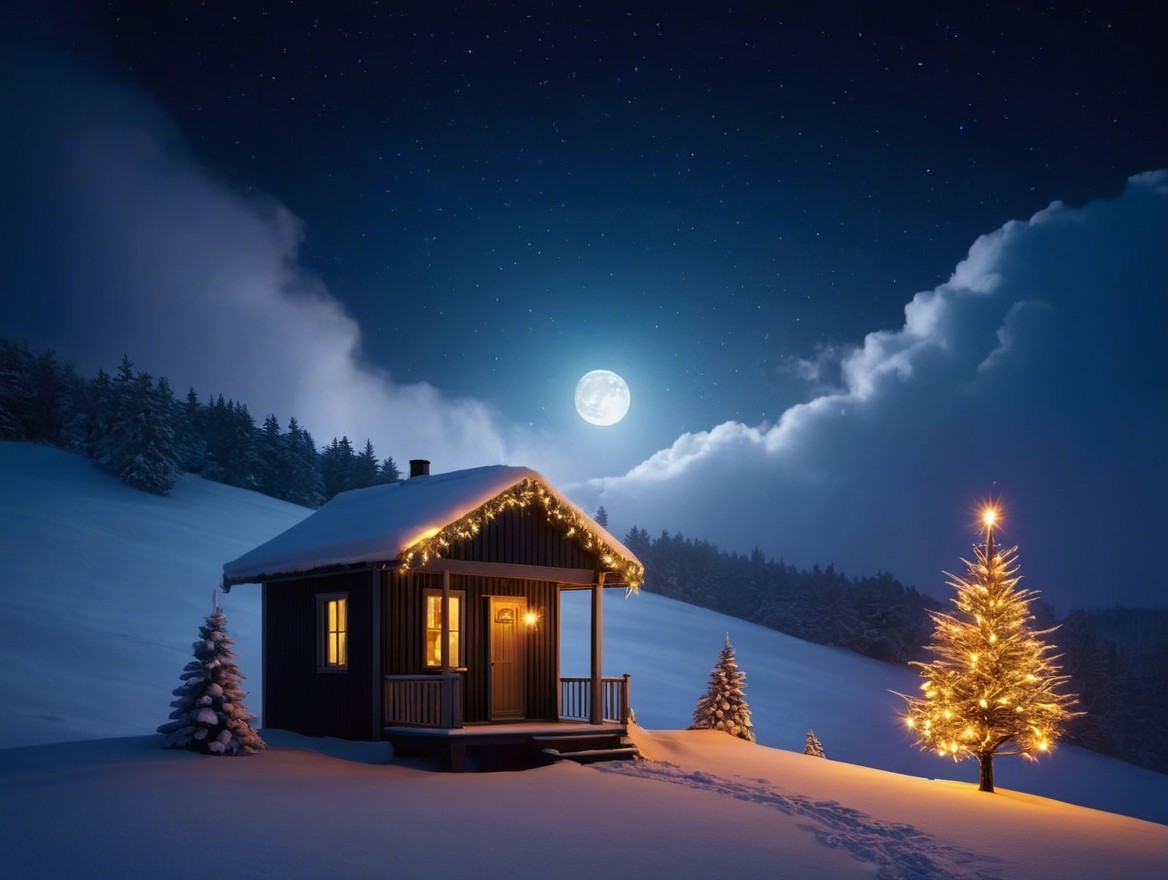 A cozy cabin adorned with lights sits amidst a snowy landscape under a luminous moon. A beautifully decorated Christmas tree glows nearby, surrounded by tall, frosted trees.