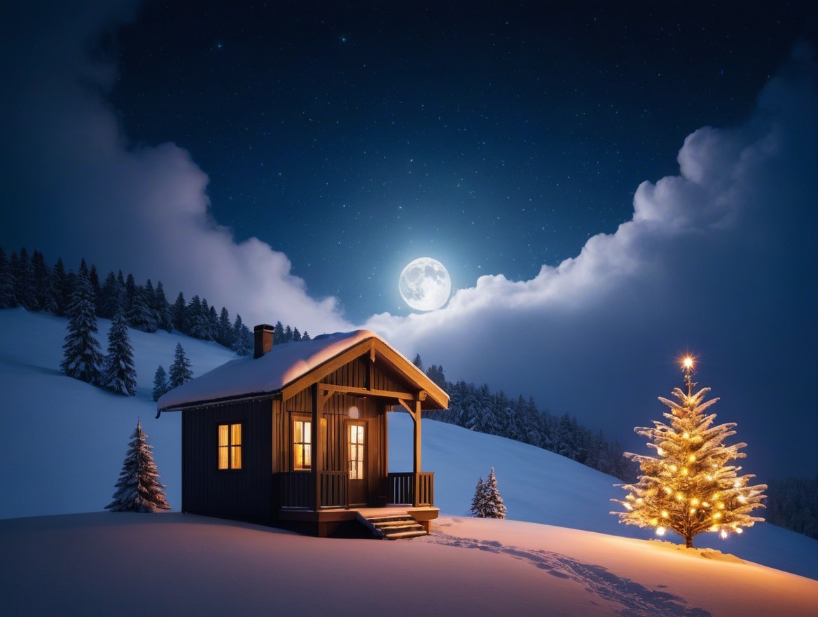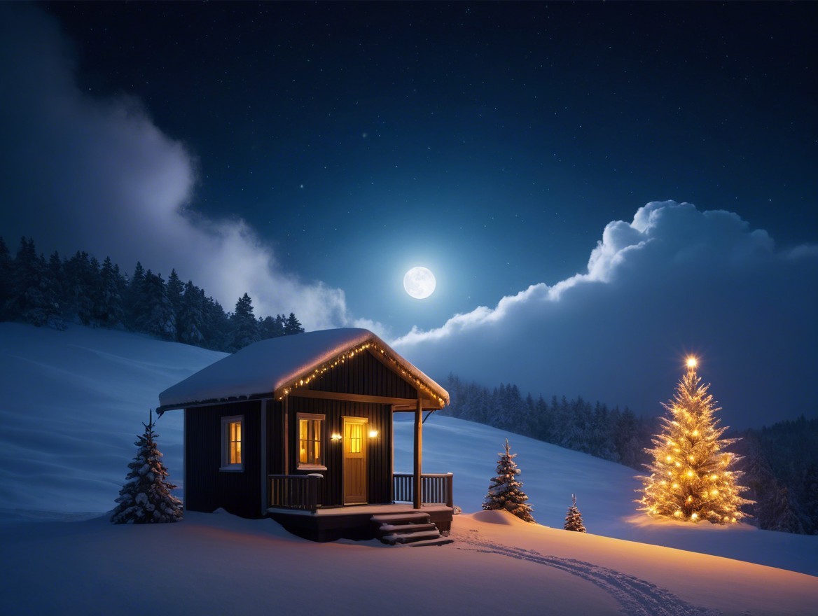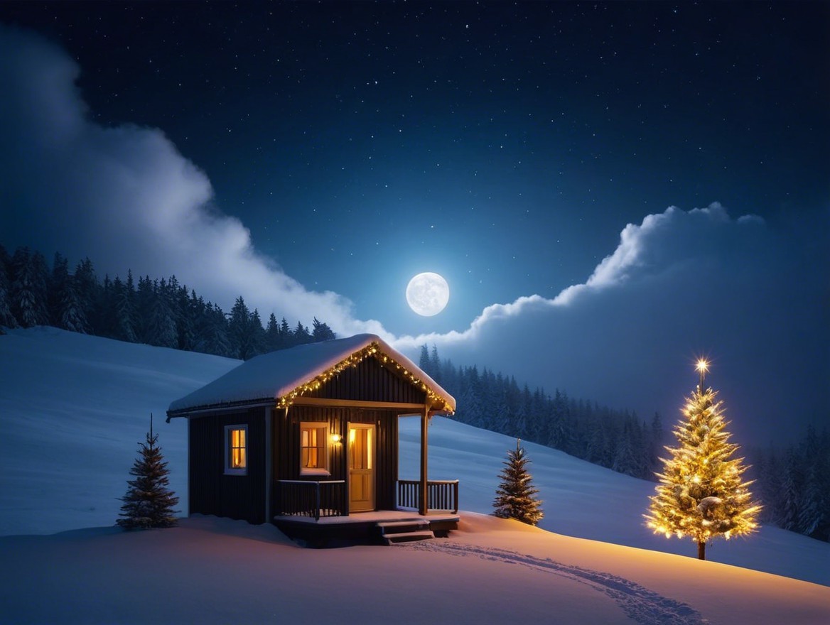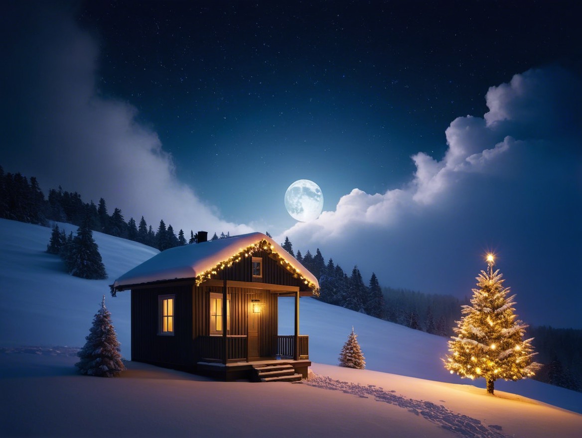 A cozy cabin adorned with lights sits amidst a snowy landscape under a luminous moon. A beautifully decorated Christmas tree glows nearby, surrounded by tall, frosted trees.
