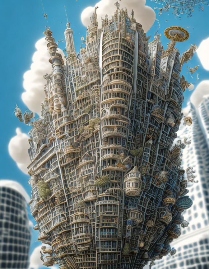 Whimsical skyscraper blending steampunk and fantasy elements