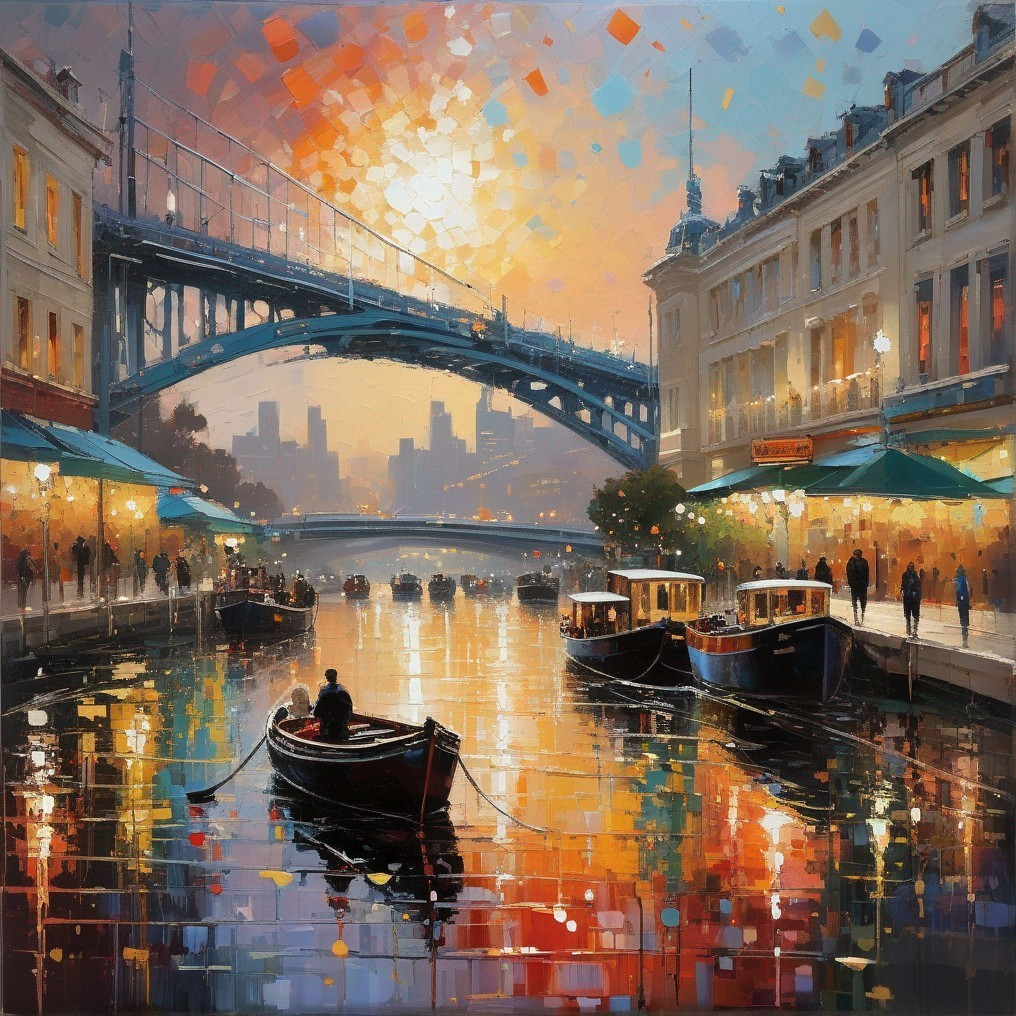 A vibrant, impressionist-style painting of boats on a river at dusk with a bridge overhead and city lights reflecting on the water.