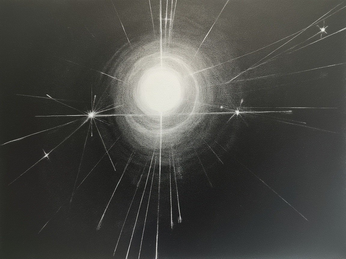 The image depicts a vibrant explosion of light in a dark cosmic space, featuring radiant colors and streaks that represent stars and celestial energy, evoking a sense of cosmic wonder.