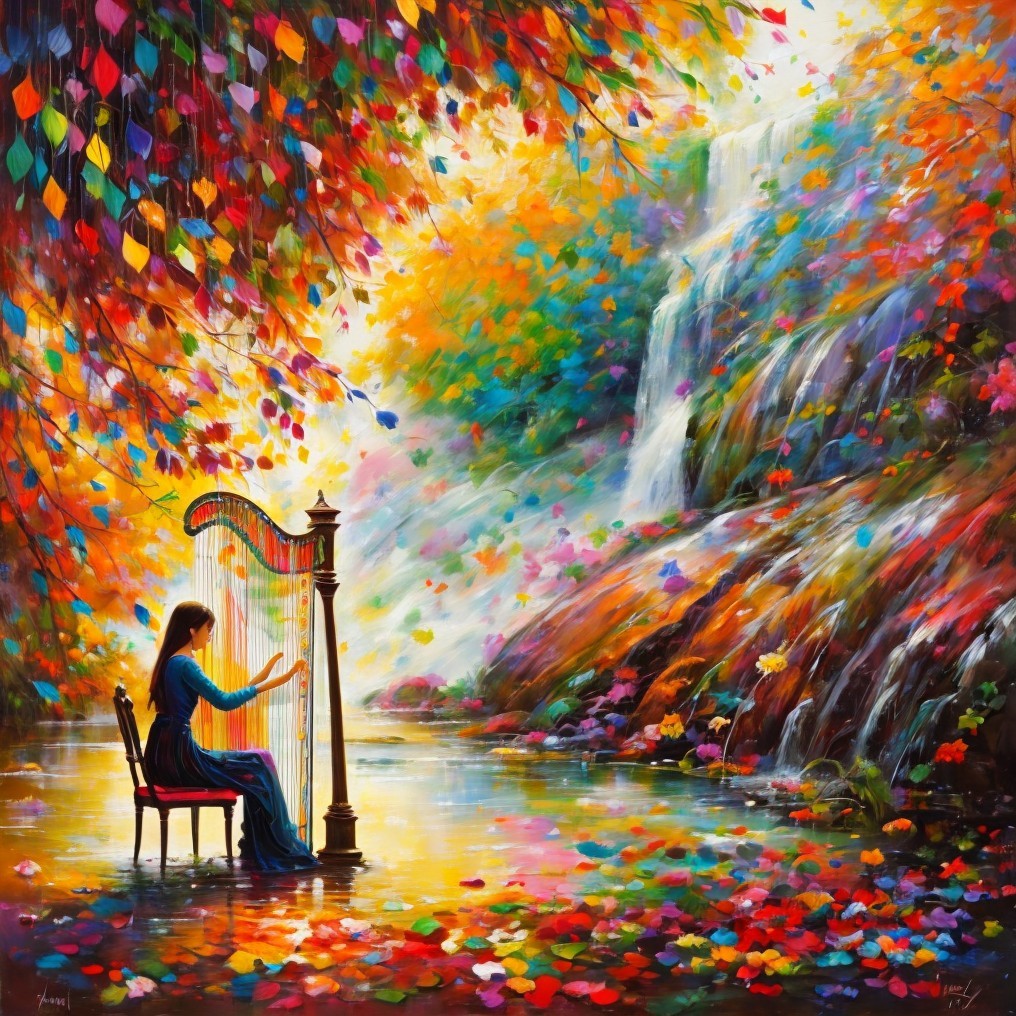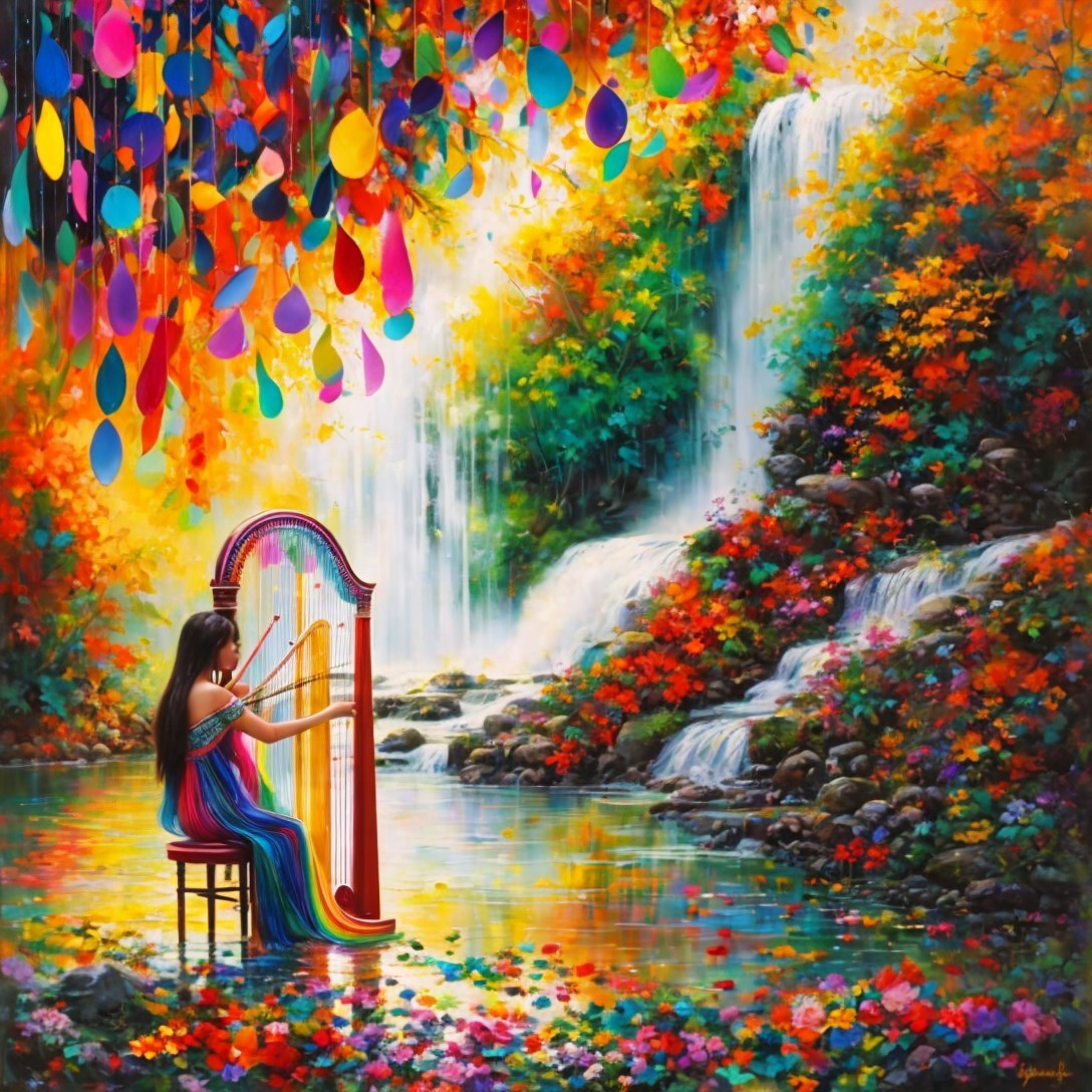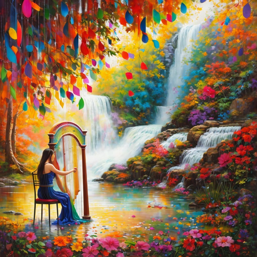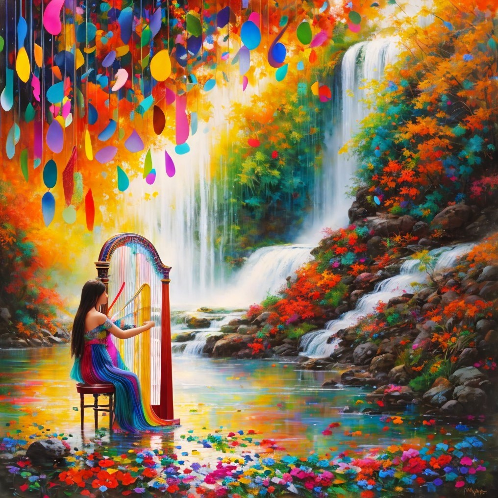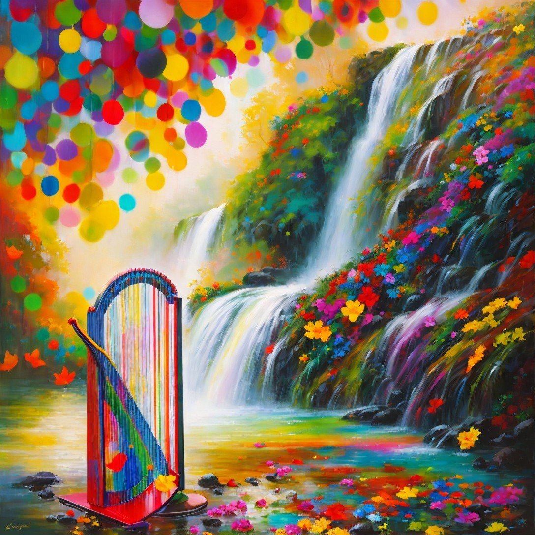 Colorful Painting: Waterfall, Harp, Flowers, Lights