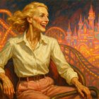 Prompt: oil painting by Margaret Keene, slender very mature fashion model age 65, blue eyes, Carmen Dell' Orifice/Julie Harris/J.K. Rowling face, big gaunt cheekbones, thin red lips, flowing blonde hair, white button-down shirt, tucked into light pink trousers, dark brown belt, seated on roller coaster car, vibrant amusement park at night brightly lit, gold and pink diffused dreamy glow over everything, millions of dazzling lights and fairytale castles lit with neon, facing toward the right. happy, open-mouthed smile,