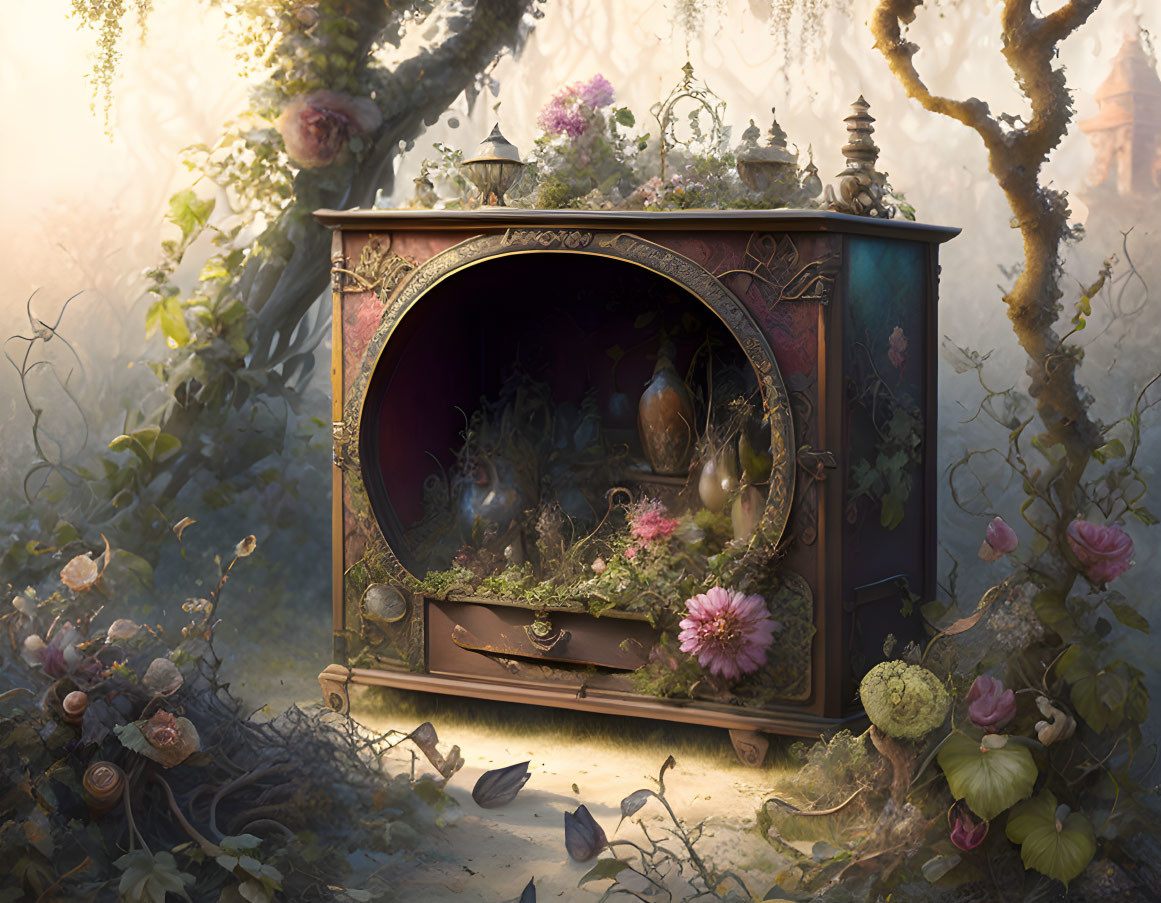 Antique cabinet with glass orbs, moss, ivy, pottery, rose, and sunlight.