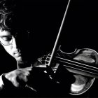 An artistic depiction of a musician with a flowing face and vibrant colors, playing a violin. The figure is stylized with shiny gold and blue elements against a black background, creating a striking contrast.