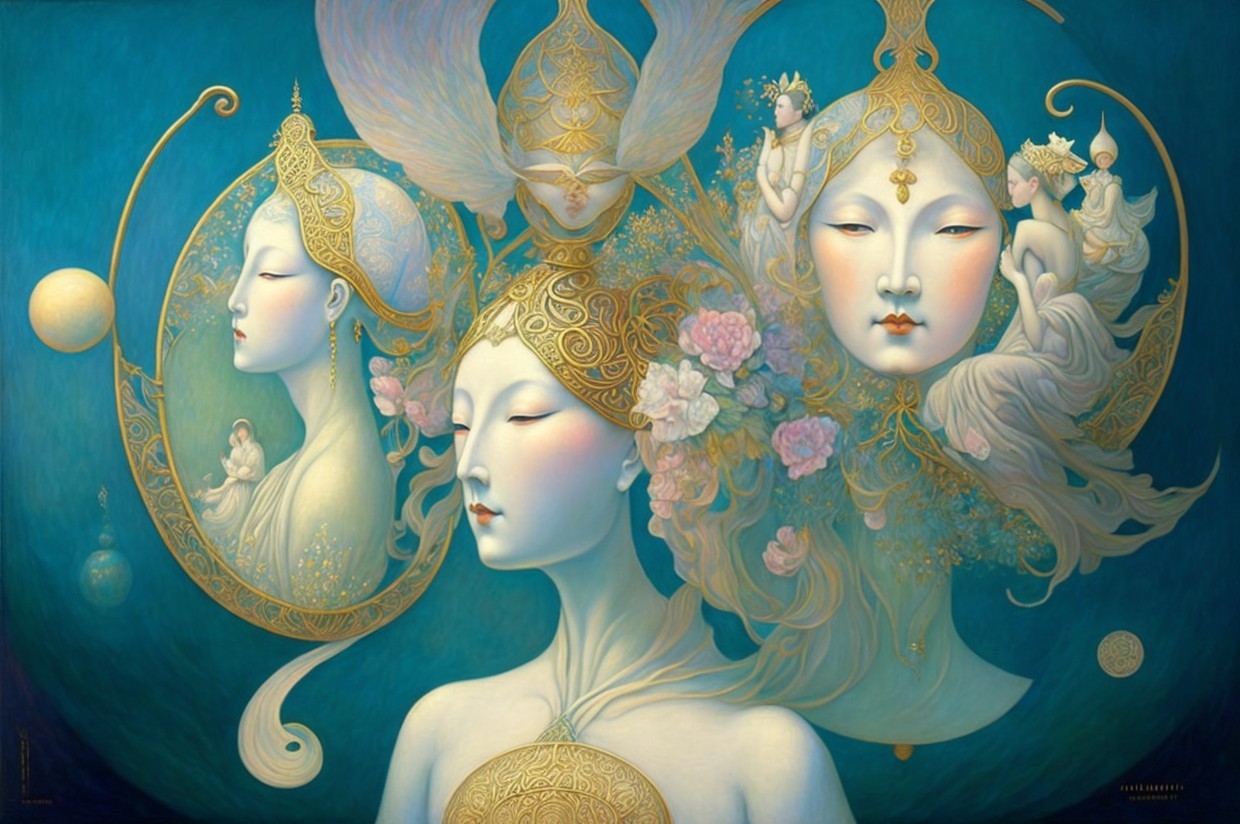Tableau vivant of zen meditations, oil on canvas early 19th century (1900s-1930s) painting inspired by Hieronymus Bosch, Erte, Klimt, Stanislav Senchuk, Arturo Elena, Dalí, Toulouse-lautrec, mucha, Ernst. , illogical pairings, surreal-art nouveau blend and fusion of styles, celestial elongated female subjects with organic shapes and exaggerated proportions, wearing flowing dresses or robes, soft pastel jewel tones (rose, sage, lilac, aqua, seafoam, , golden luster, pink and sea foam undertones, luminous opalescent skin, floating gilded dharma wheels, prayer beads, om and chakra symbols in delicate gold filigree, butterflies, mythical tiny spirit animals, dreamlike lighting, magical and peaceful, lush garden of paradise. subtle ivory pearl-escent undertone in all hues, painterly effect with visible brush strokes.
