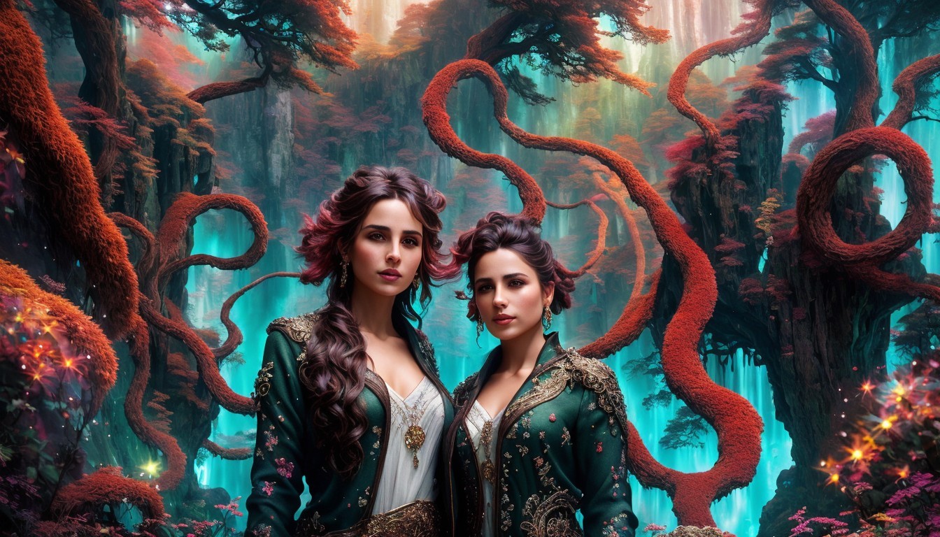 Two ethereal women stand amidst a fantastical landscape filled with vibrant colors and towering trees, dressed in ornate garments, exuding a mystical aura against a cosmic backdrop.