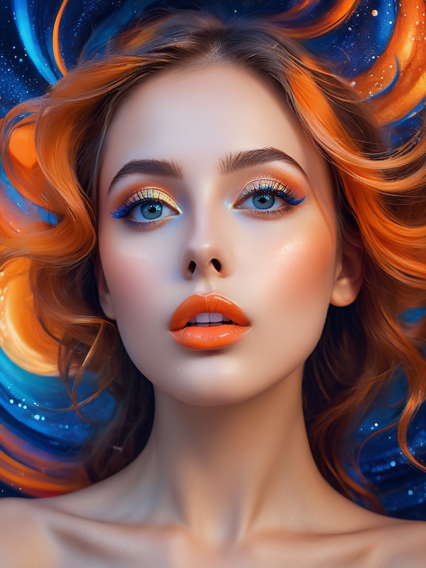 A stunning portrait of a woman with bright orange hair and vibrant makeup. Her blue eyes, glowing skin, and bold orange lips contrast beautifully with a swirling, colorful background.