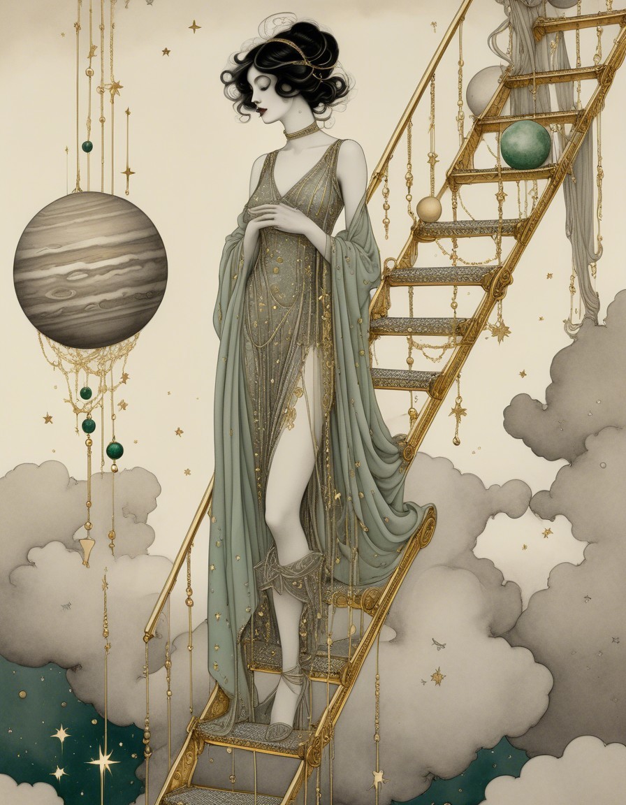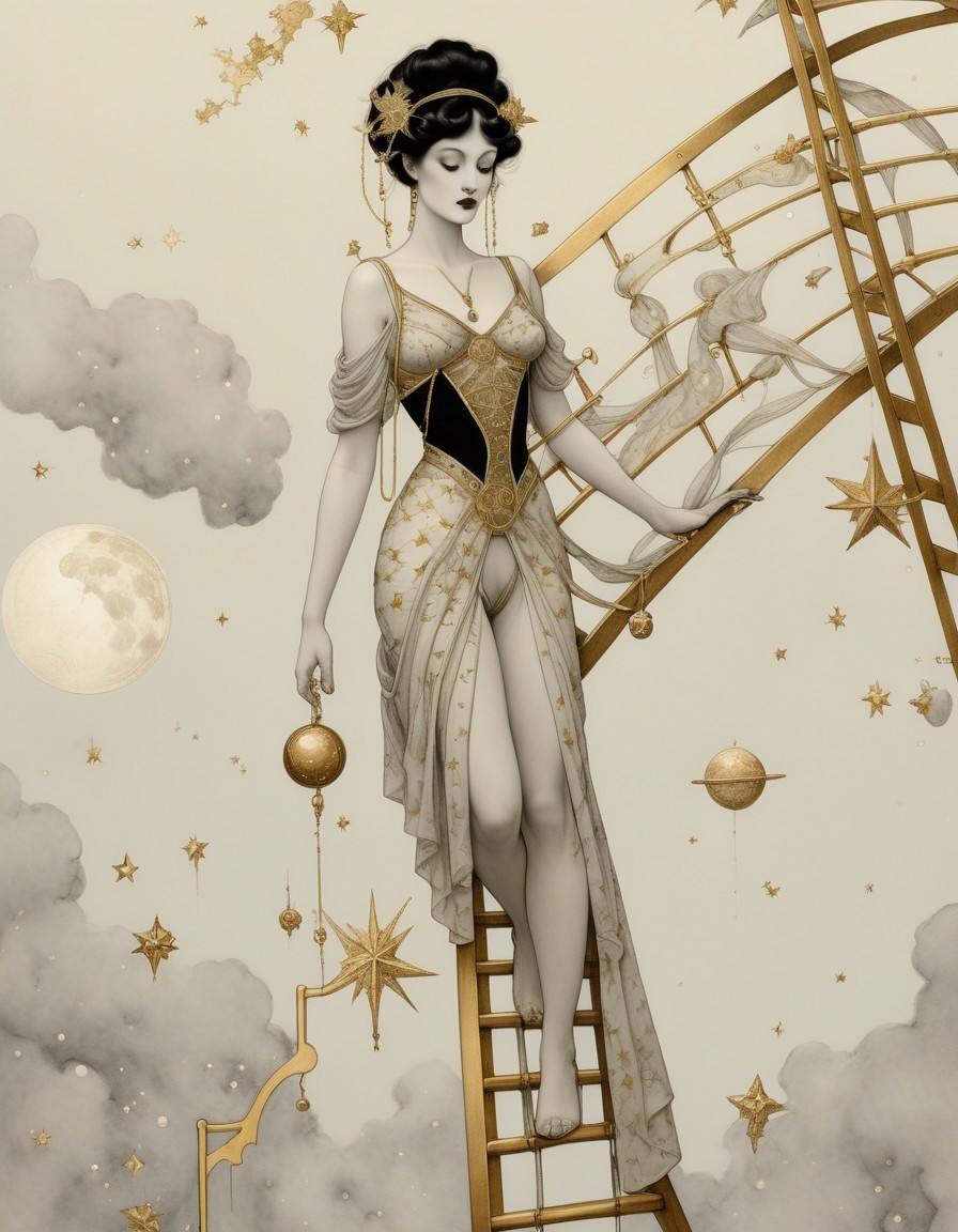 A woman on a ladder touches a celestial mobile with stars and planets against a moonlit sky.