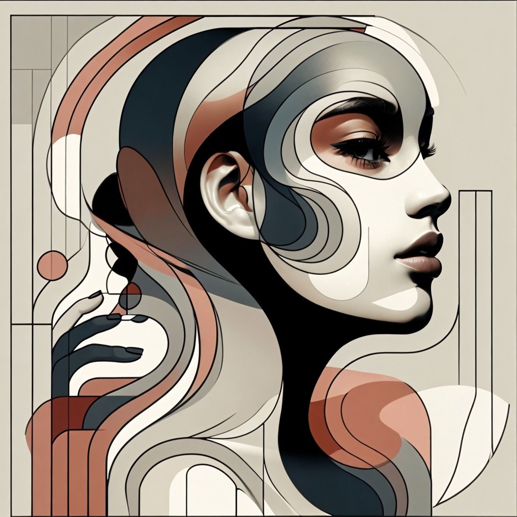 An abstract portrait featuring a stylized profile of a woman. Curving lines and geometric shapes in muted tones create a harmonious blend of form and color, highlighting elegance and depth.
