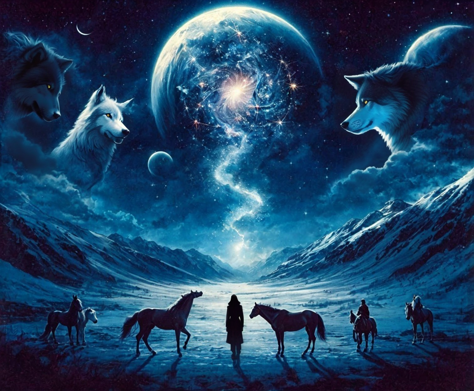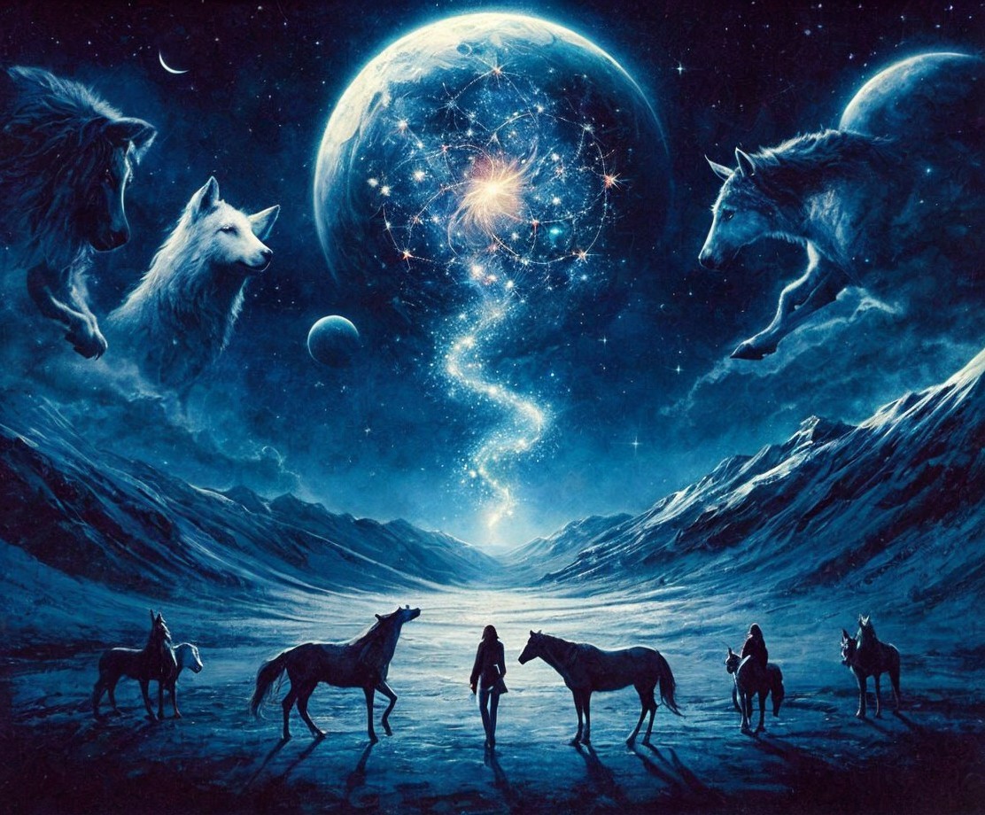 Prompt: At the top center, a globe-shaped galactic portal. It is flanked by the cosmic ghostly spirits of ancestral wolves. Below, mountains and a valley. In the foreground, shadowed figures of First Nation warriors and horses.