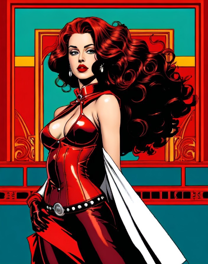 a beautiful red-haired woman. She is wearing a female tuxedo with a red cravat and red cummerbund and red shoes. Red lips and red nails. everything else is white or black and standing on a white staircase